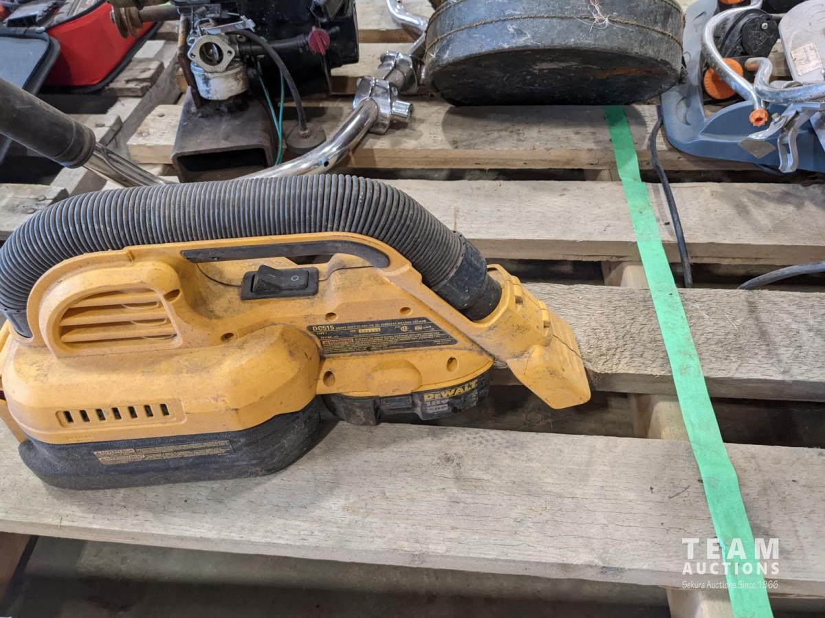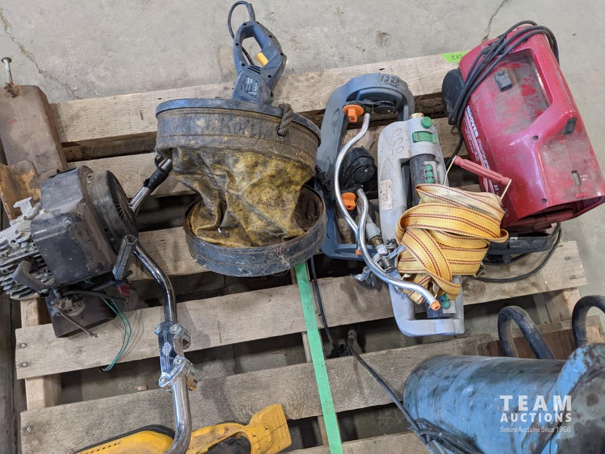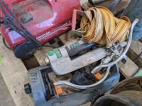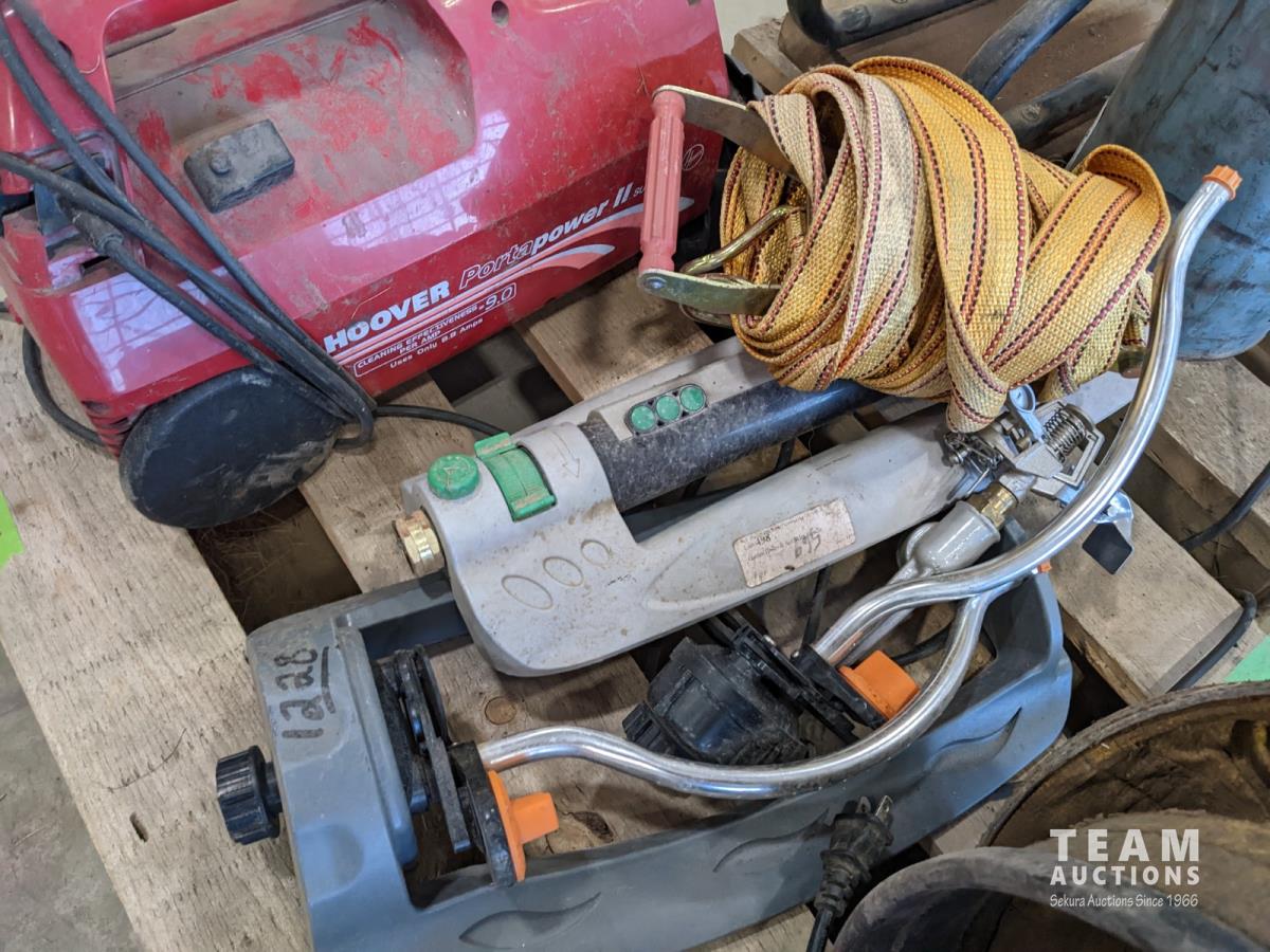 DeWalt vacuum, motorcycle wheel chock, Mastercraft reciprocating saw, sprinklers, rod oven, Hoover Porta power (untested), Tecumseh motor (untested), Harley motorcycle handle bar