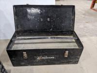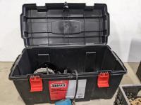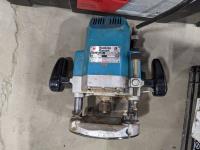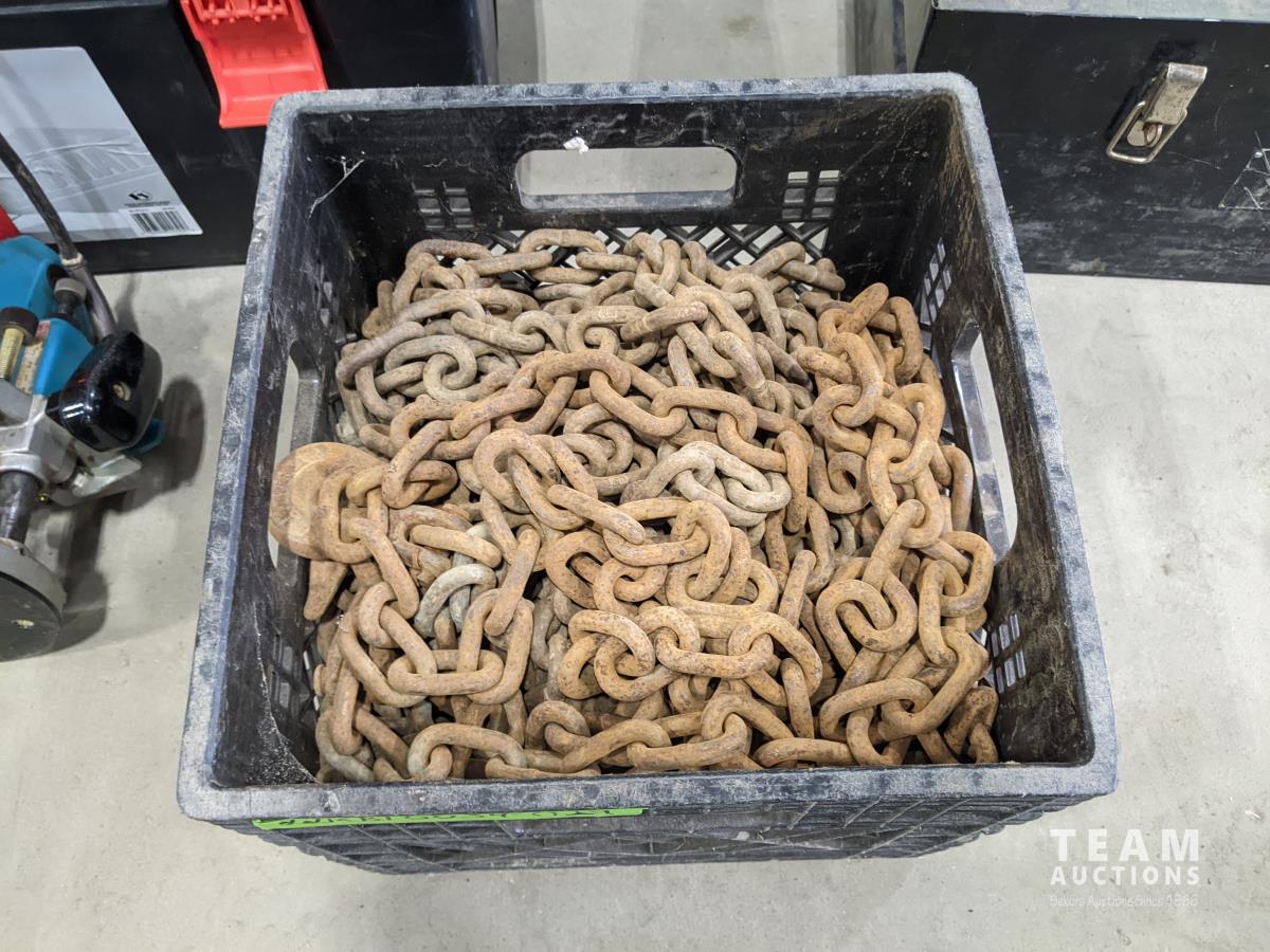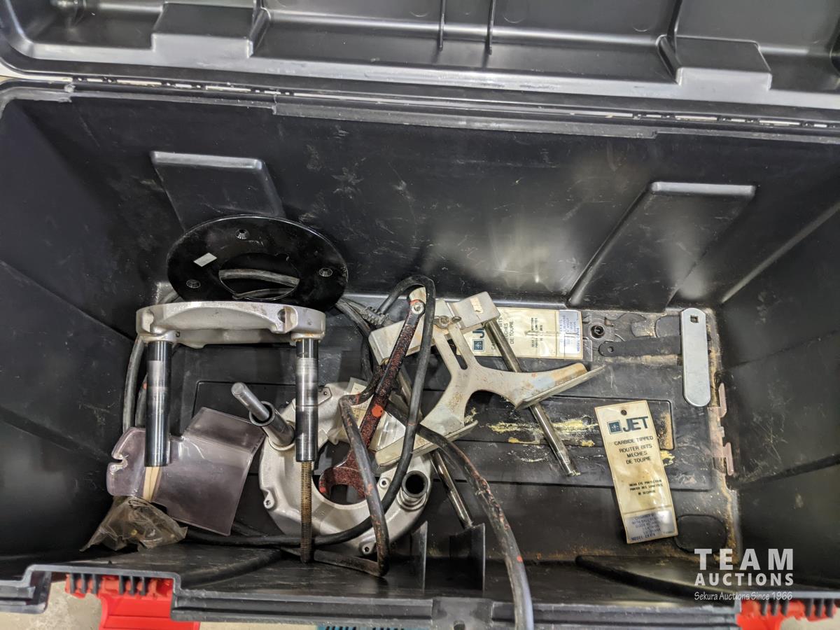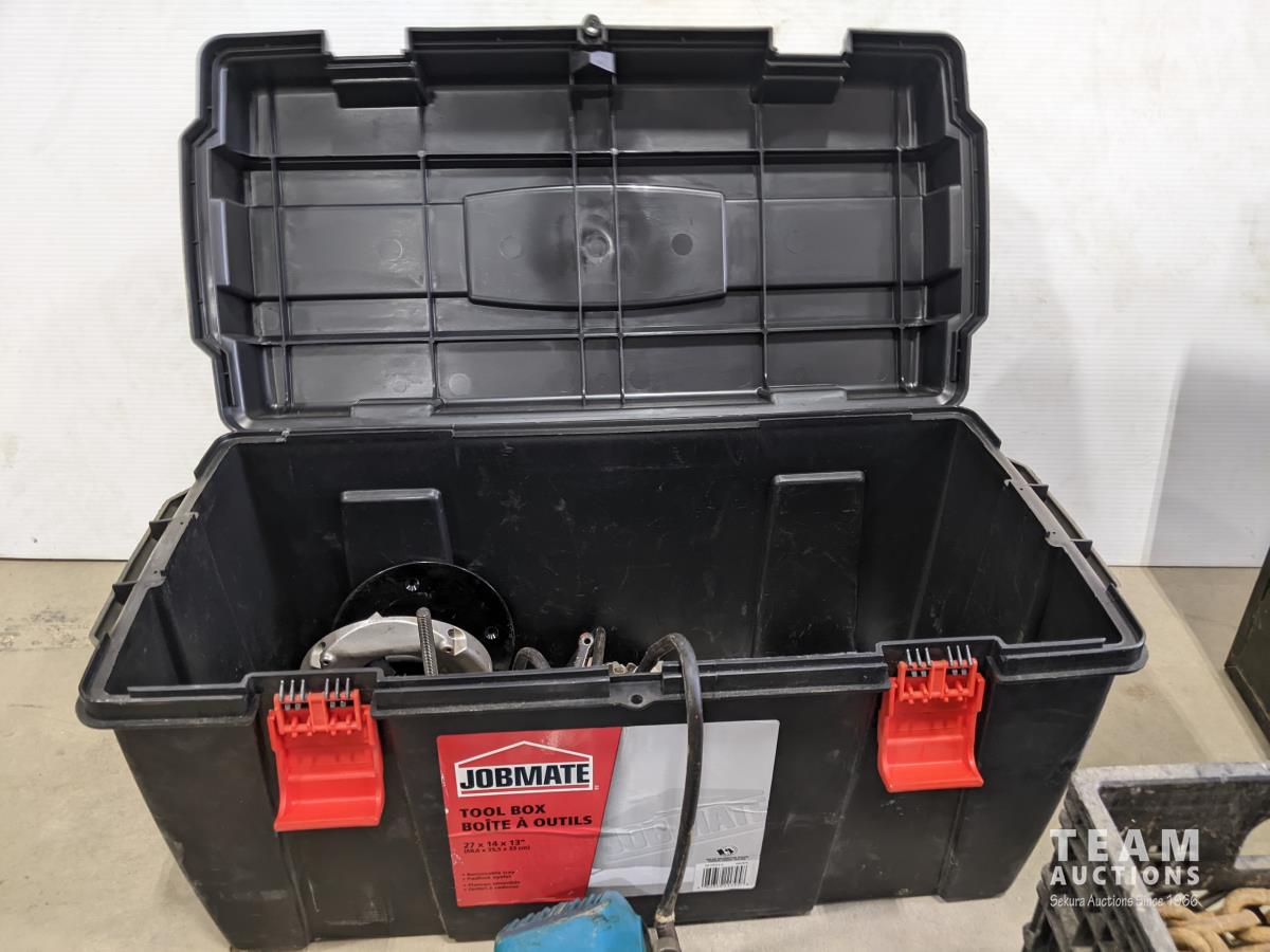 Toolbox (empty), crate of assorted chains, jobmate tool box, Makita router and extra pieces