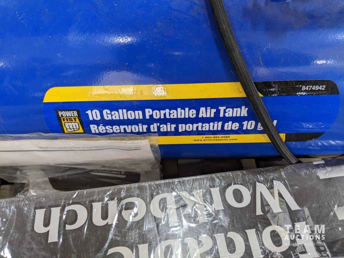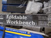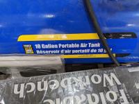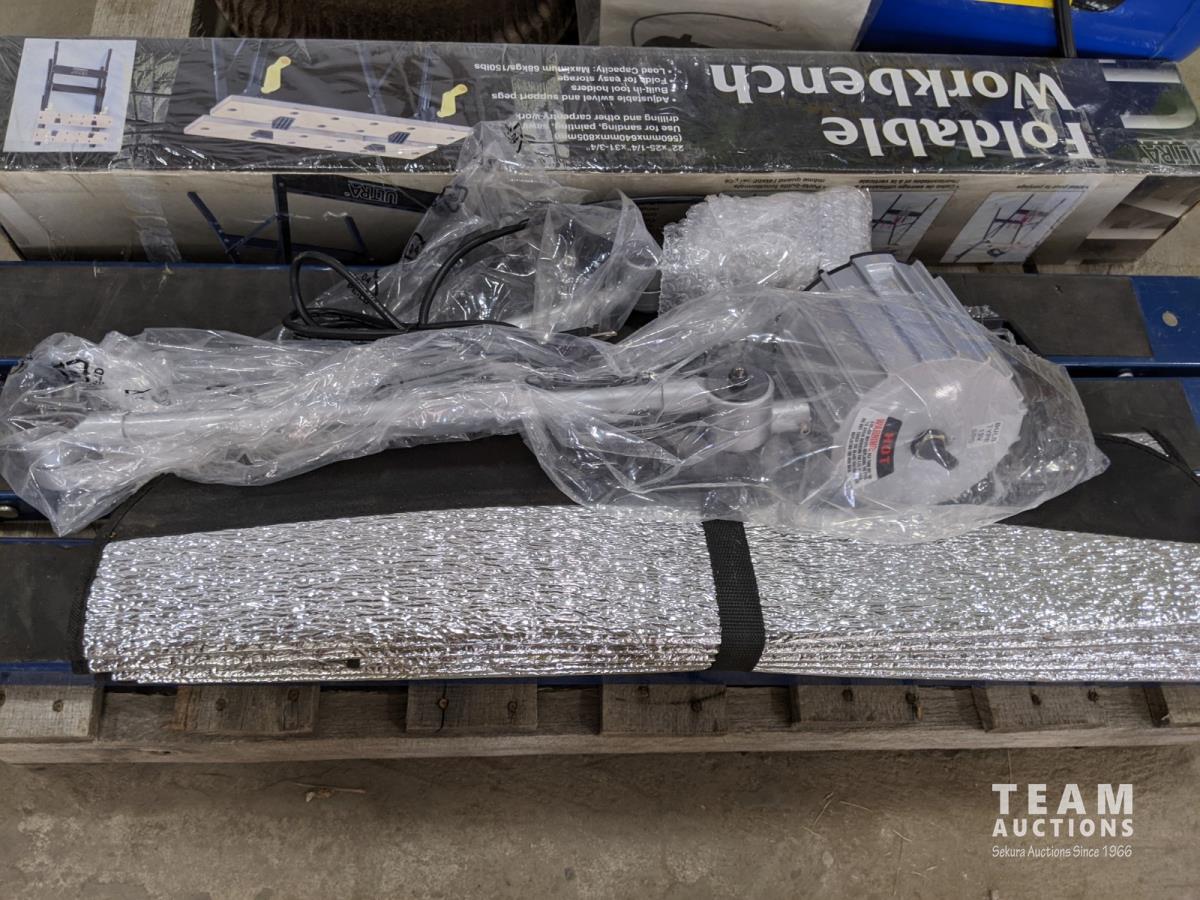 Folding work bench, vehicle sunshades, (3) working horses, angle shop lamp, 10 gallon portable air tank and home built stand