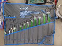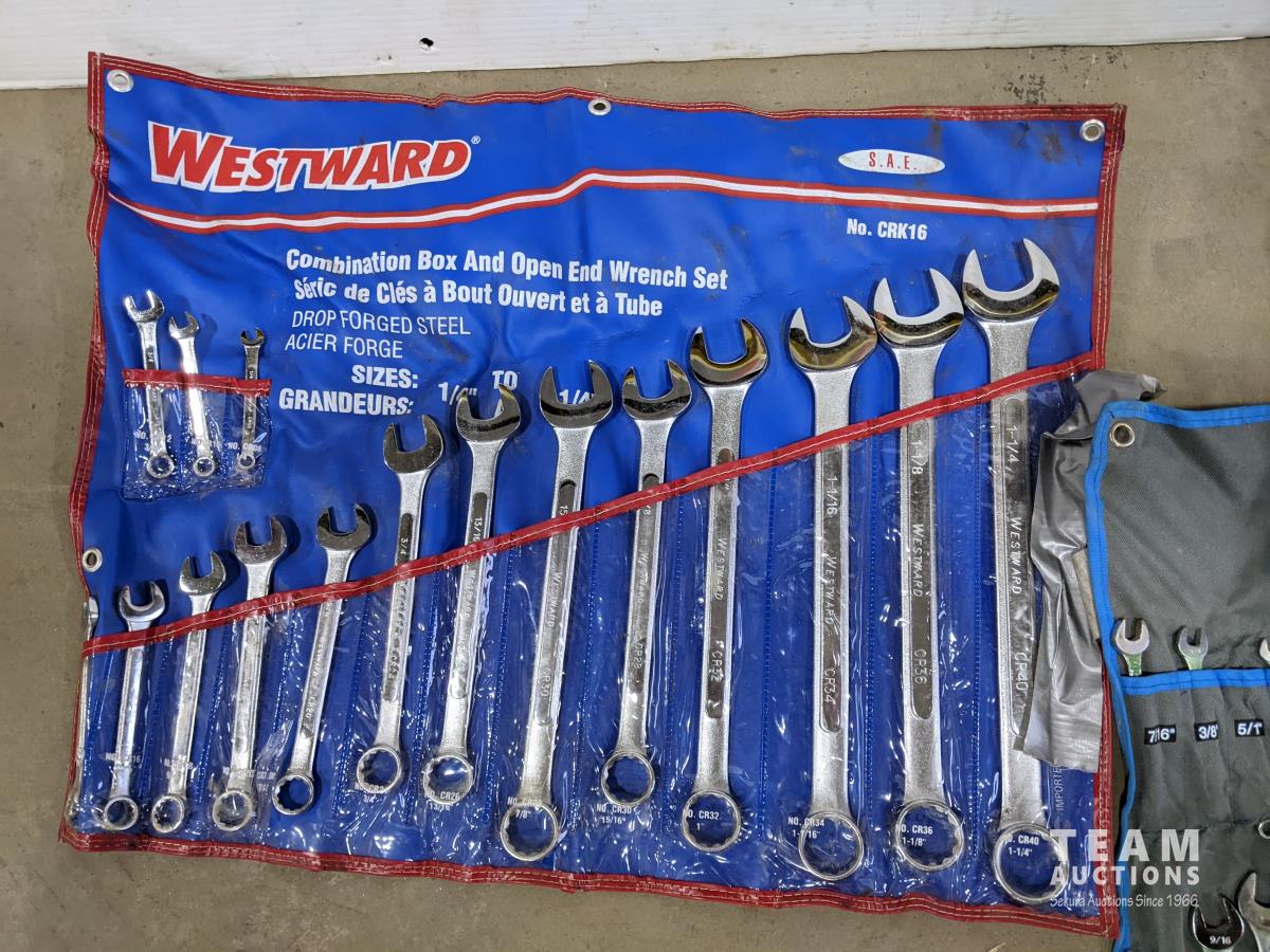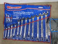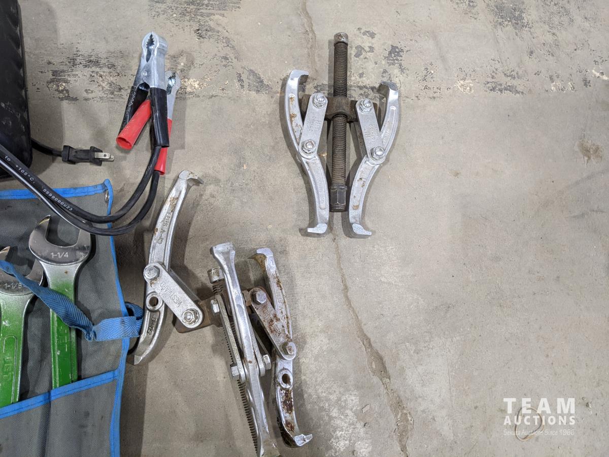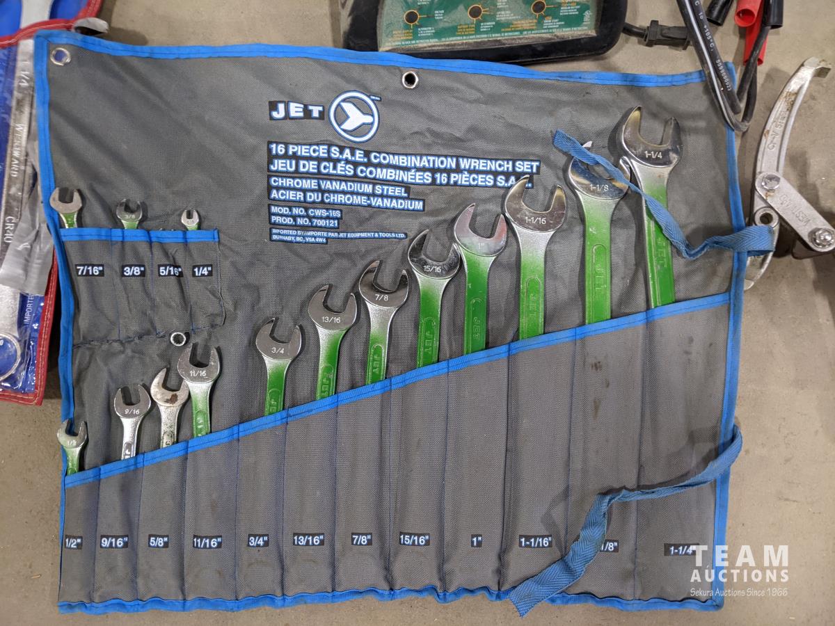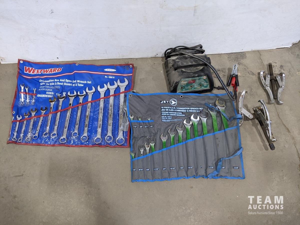 (2) Jaw gear pullers, 12v fully auto microprocessor controlled battery charger, Jet 16 piece SAE combination wrench set and Westward combination box & open end wrench set