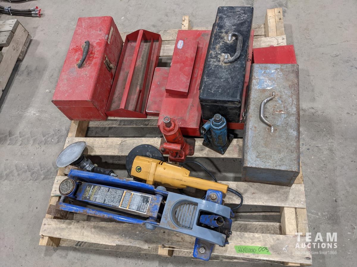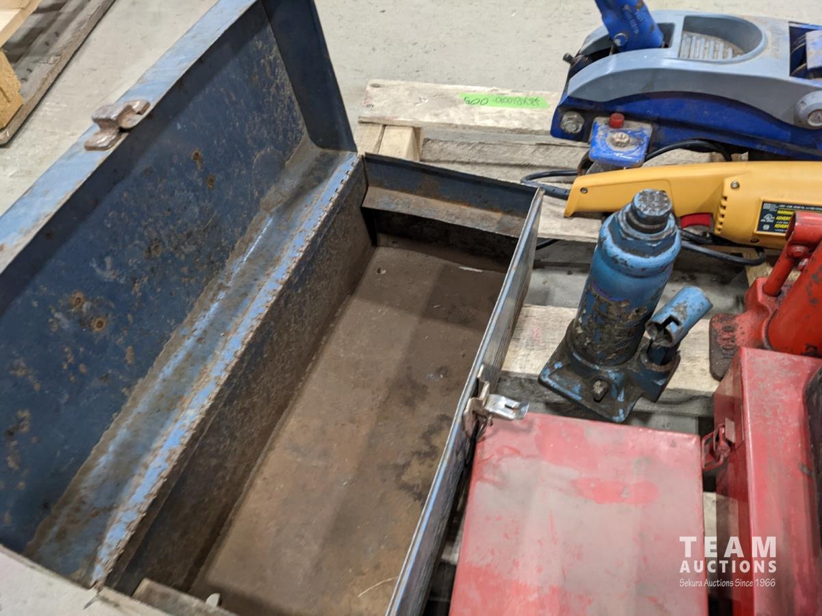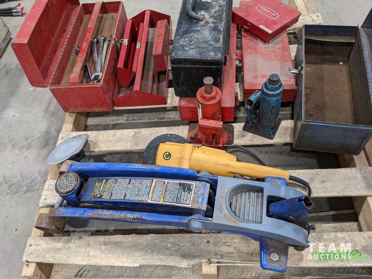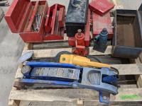 1063 Assorted Tool Boxes, Bottle Jacks, Floor Jack and Sanders