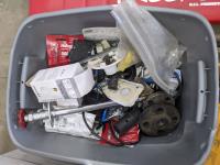 Mechanics creeper, assortment of nails, bottle jack, box of miscellaneous, electrical, hardware and outdoor air mattress
