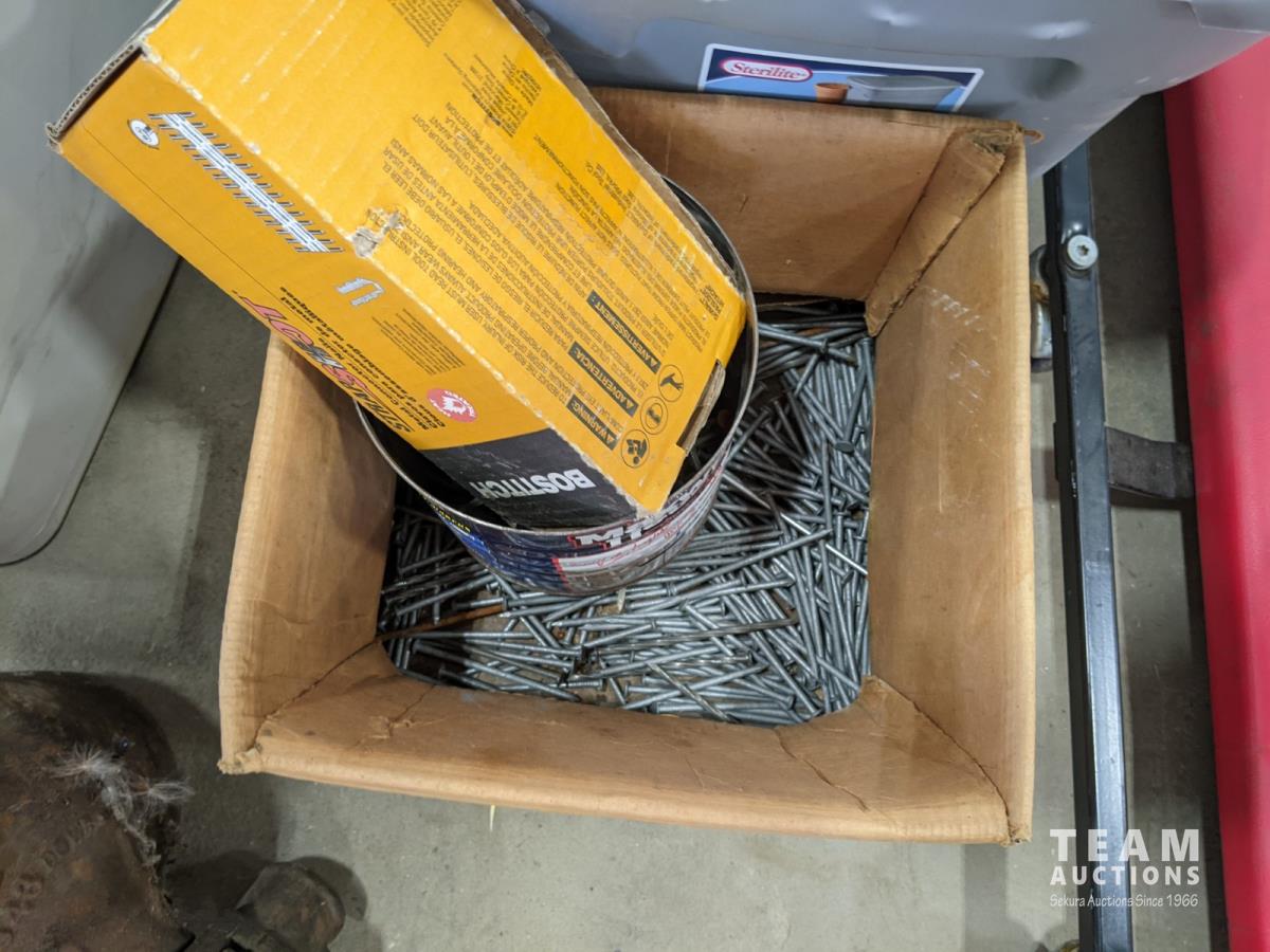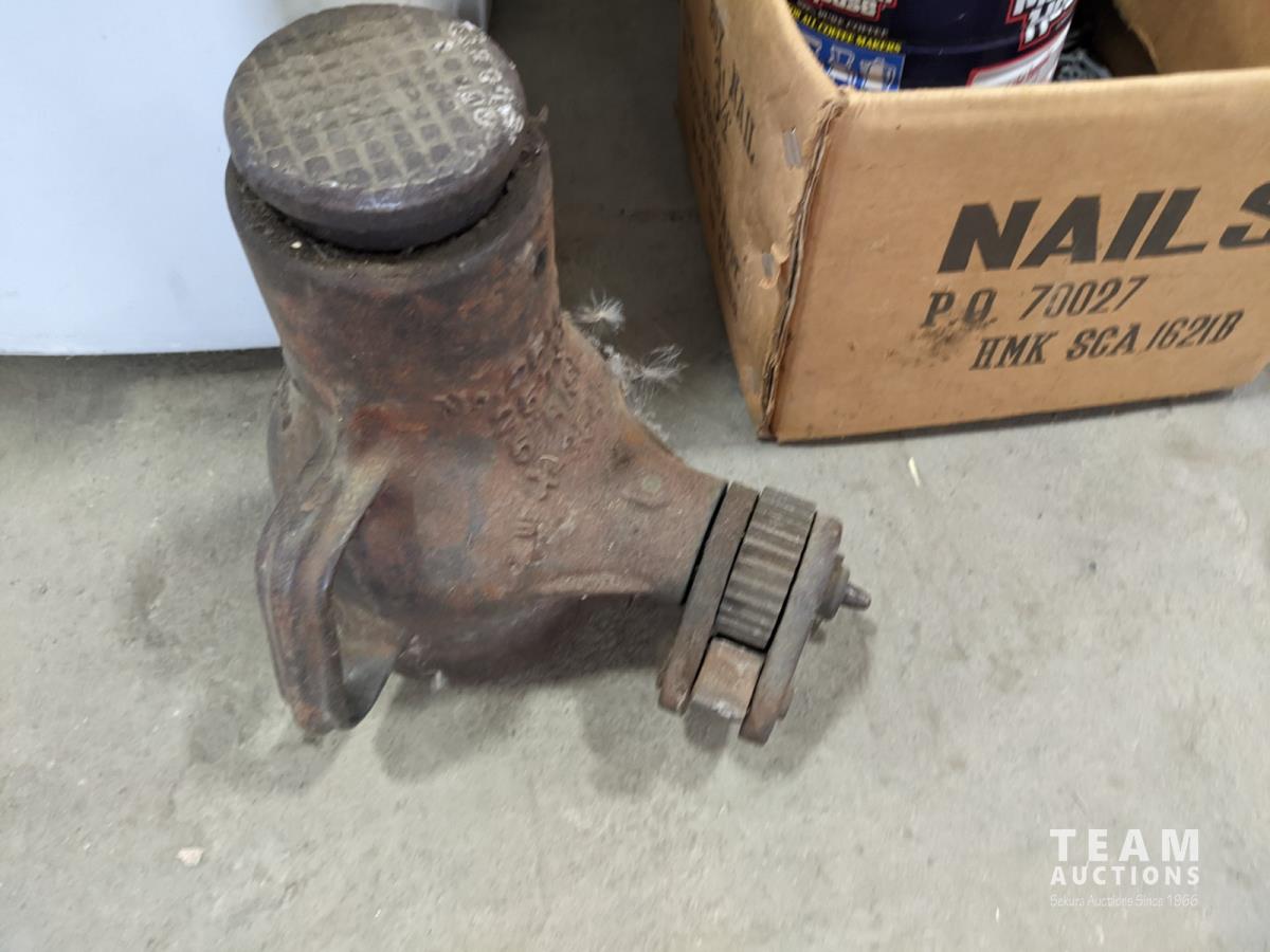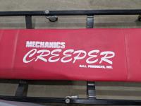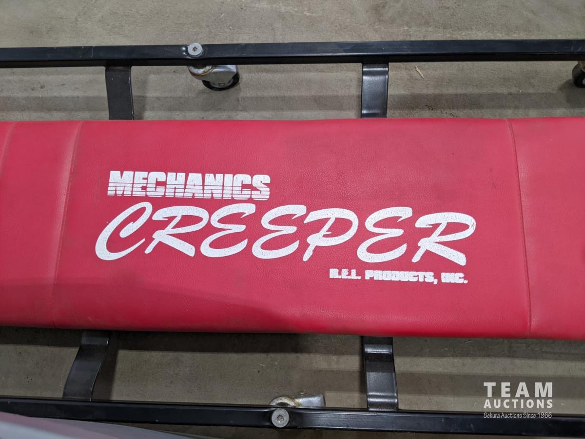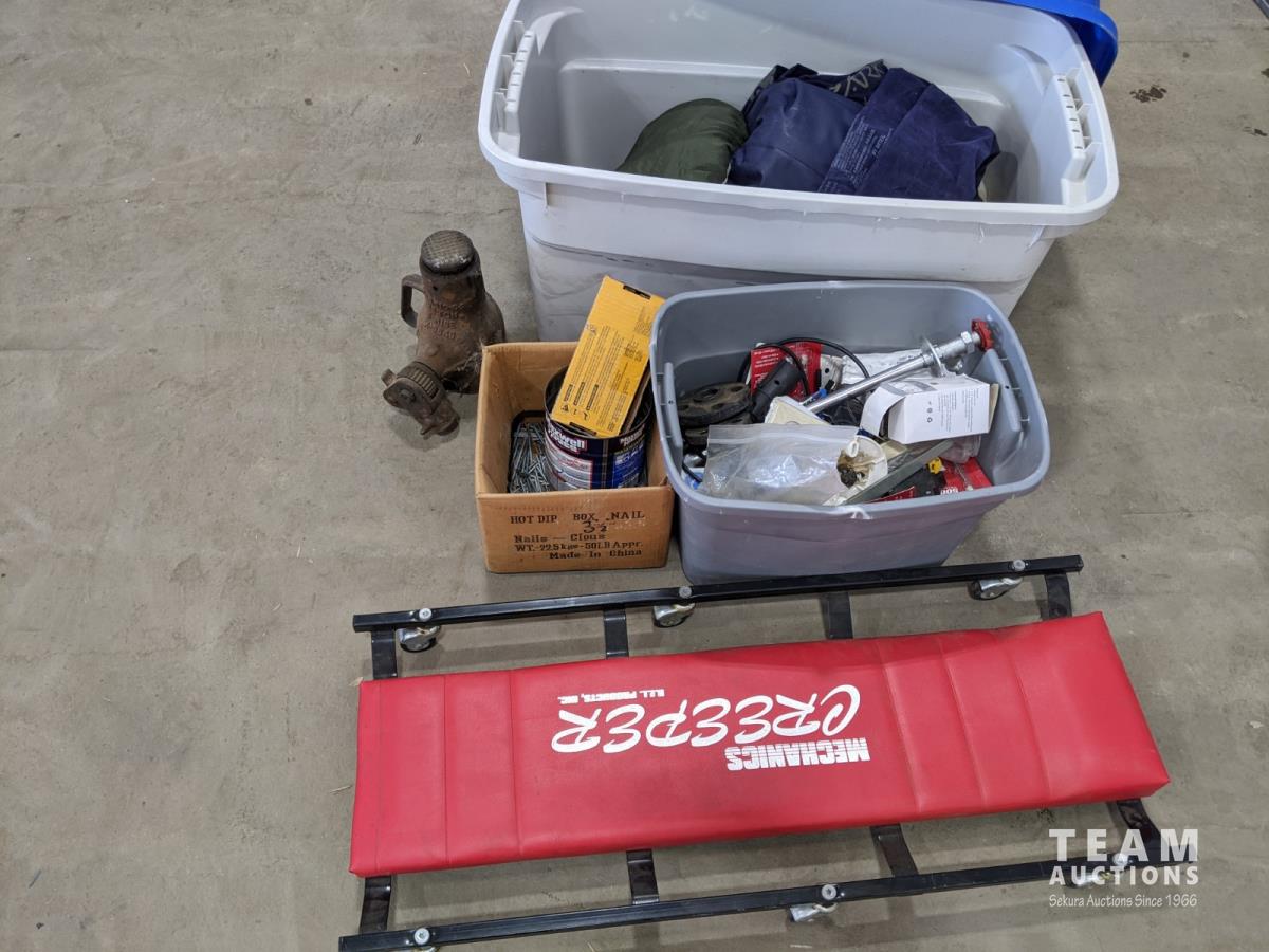 Mechanics creeper, assortment of nails, bottle jack, box of miscellaneous, electrical, hardware and outdoor air mattress
