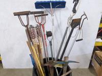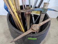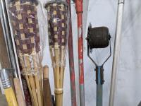 (3) pick axe, (5) scrapers, roof shovel, ice breaker, edger, (2) tiki torches, tree pruner and assortment of broom handles (Barrel included)
