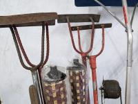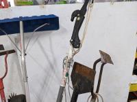 (3) pick axe, (5) scrapers, roof shovel, ice breaker, edger, (2) tiki torches, tree pruner and assortment of broom handles (Barrel included)