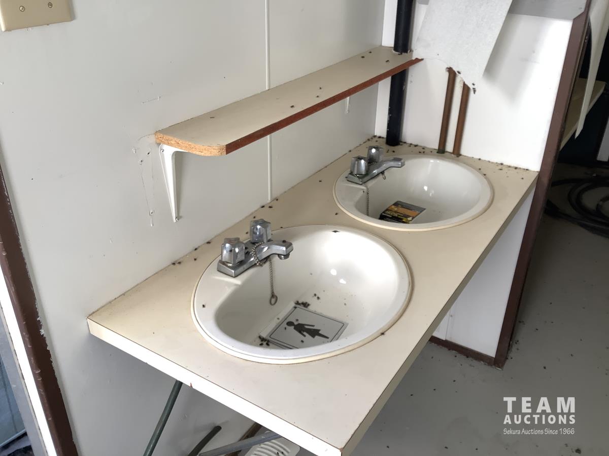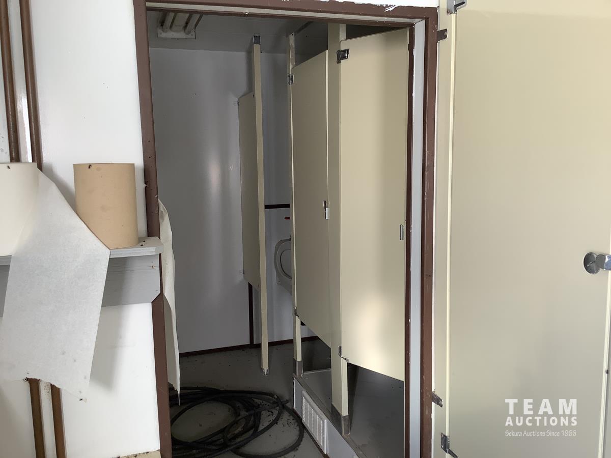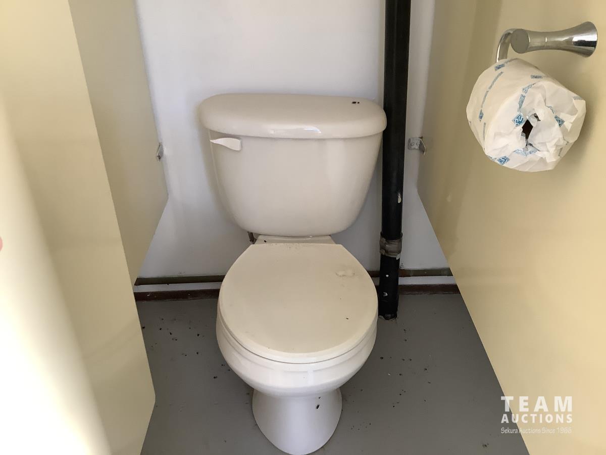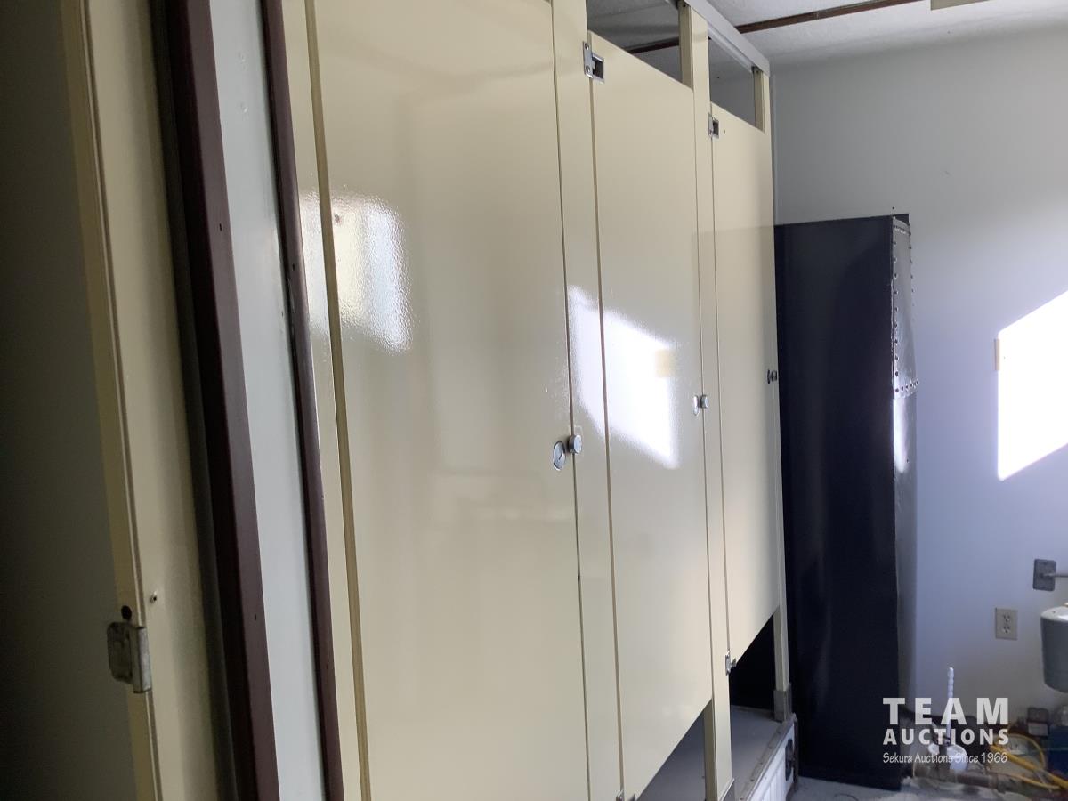Insulated, propane heated, (2) men’s urinals, (4) sinks, (5) toilet stalls