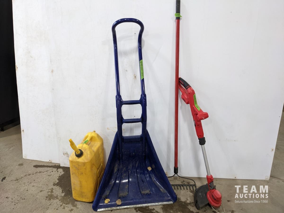 1289 Snow Shovel, Rake, Cordless Weed Trimmer and Jerry Can