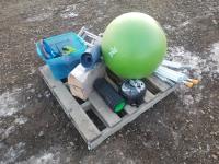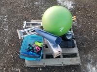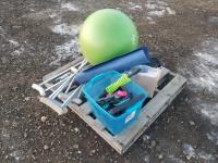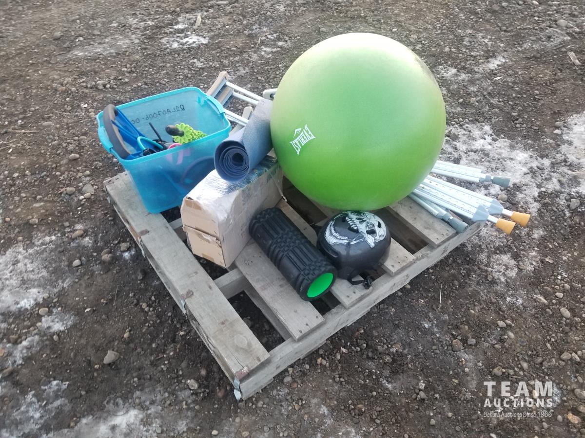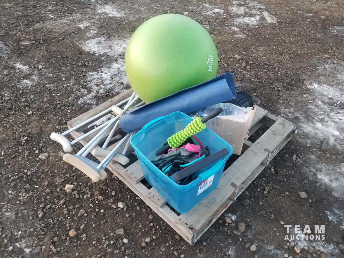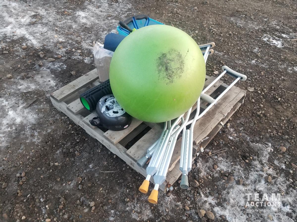 Exercise ball, tension cords, yoga mat, leg weights, roll, crutches zpr