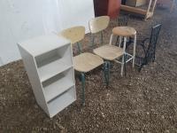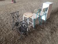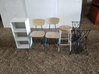 (2) small chairs, small stool, small shelving unit, antique sewing machine stand