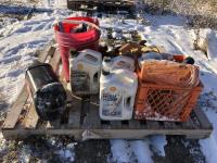 Miscellaneous oil filters, miscellaneous oil, heavy duty coolant, miscellaneous straps, trouble light, carpentry pouch, miscellaneous automotive supplies