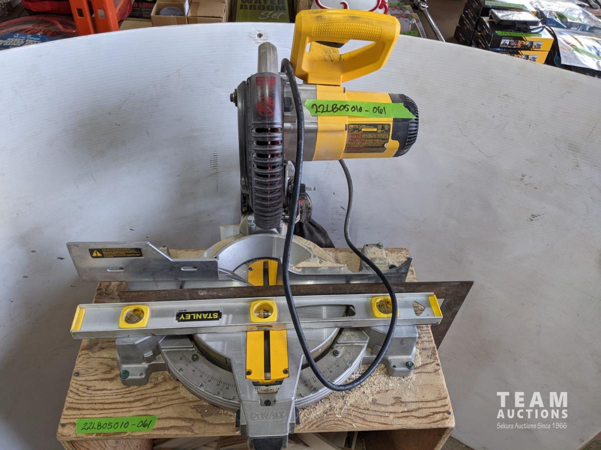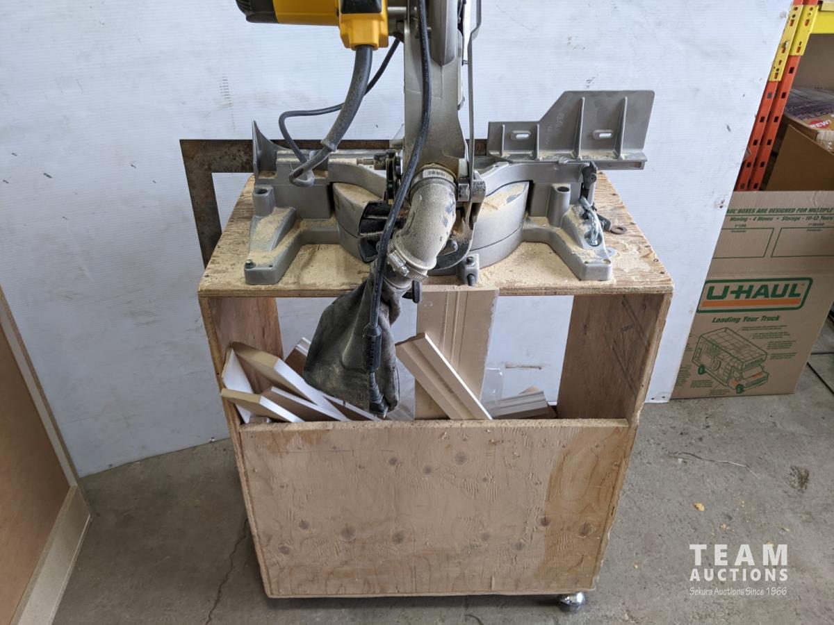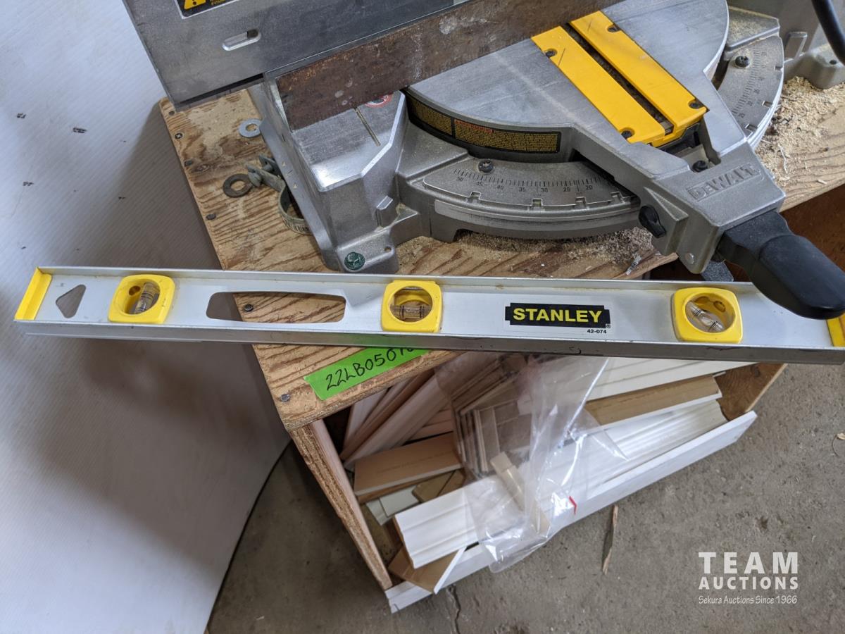 1006 10 Inch Dewalt Compound Miter Saw On Stand with Wheels, Baseboard Cut Offsnds and Stanley Level