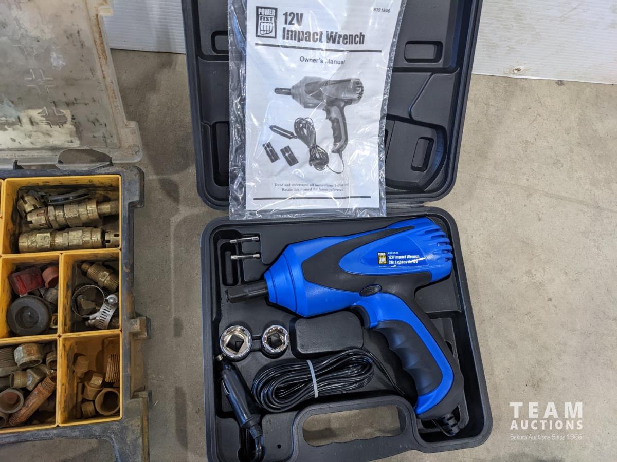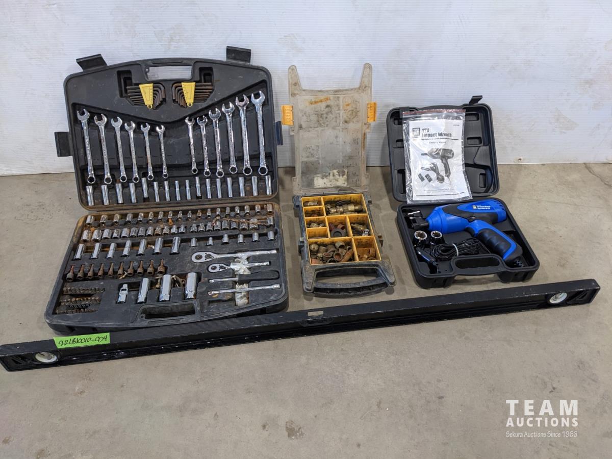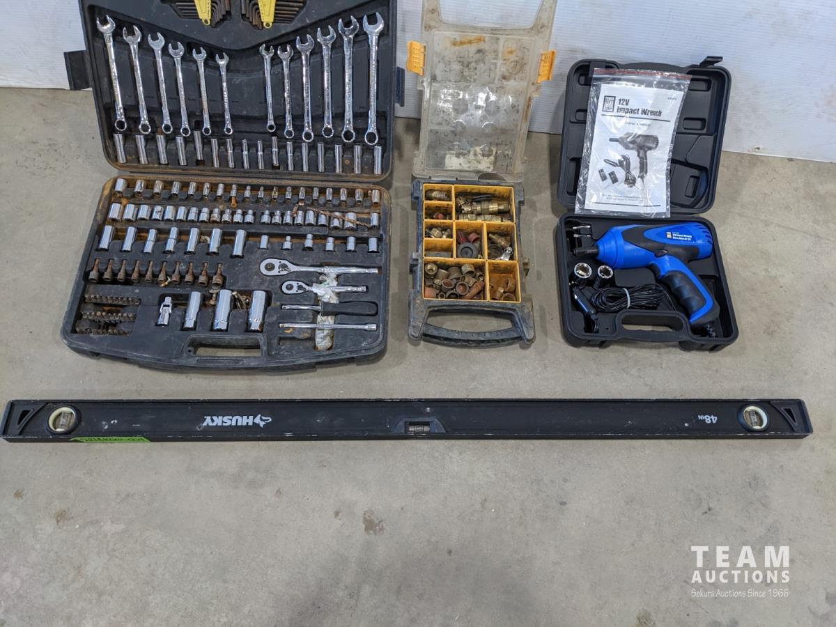12 volt impact wrench, Husky 48 inch level, socket set and wrench set