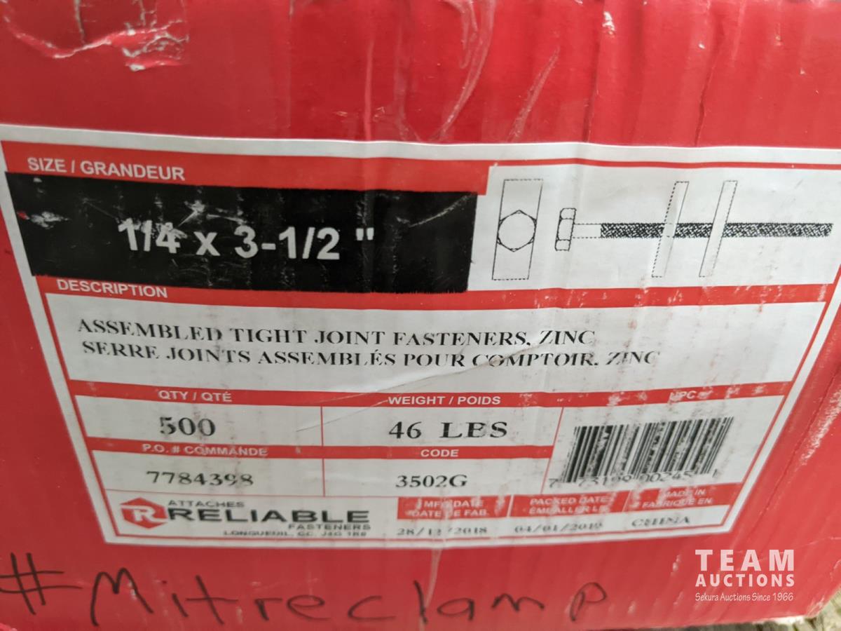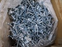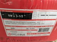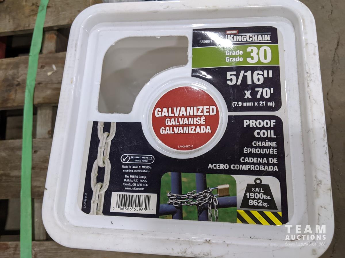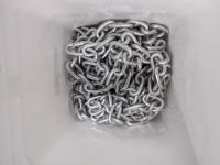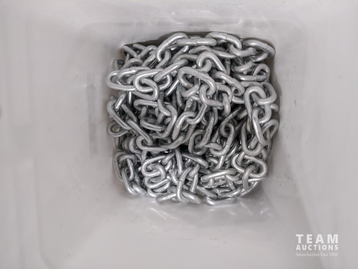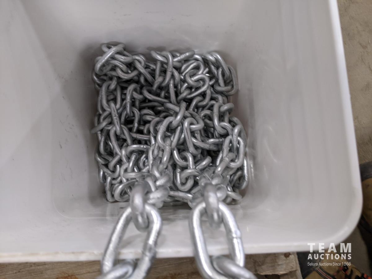 Box of 1/4 inch x 3-1/2 inch assembled tight joint fasteners and pail of galvanized 5/16 inch chain