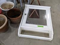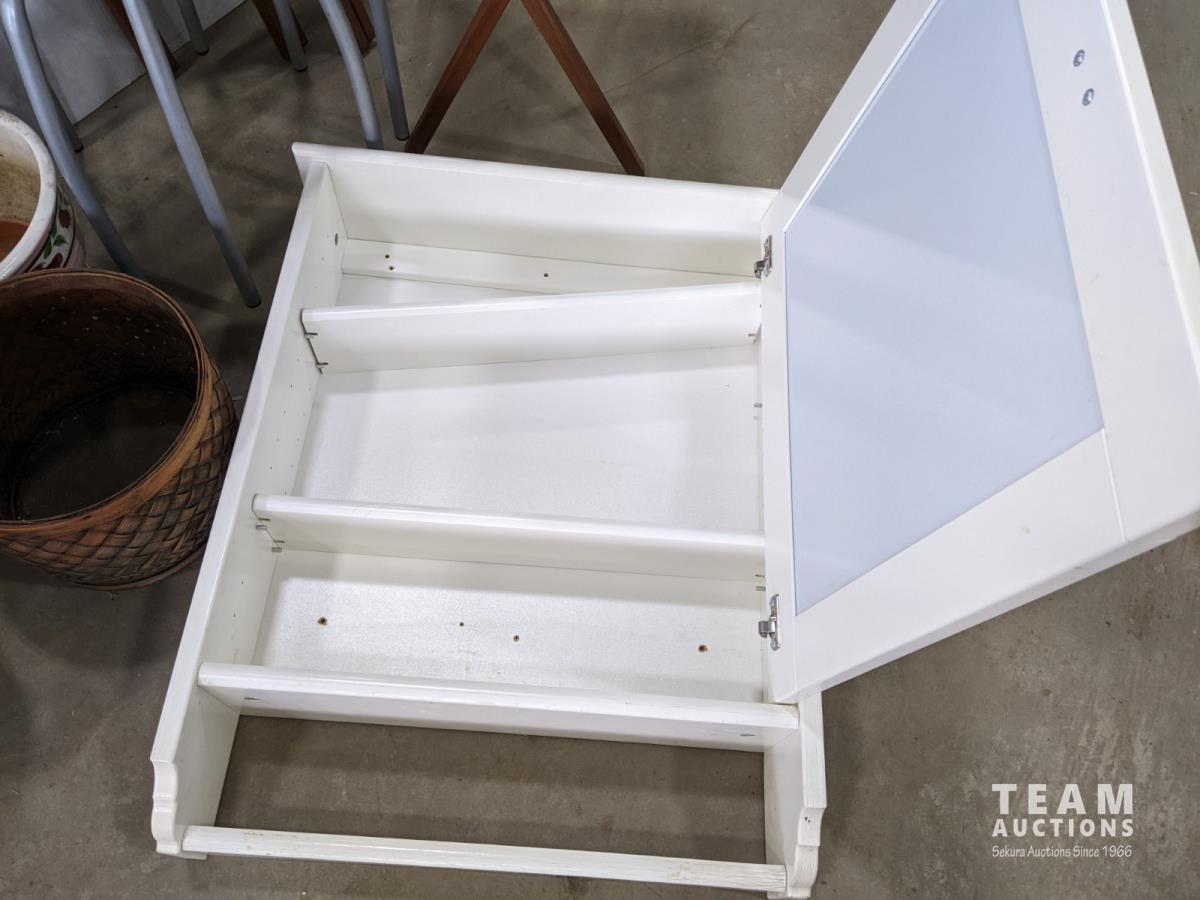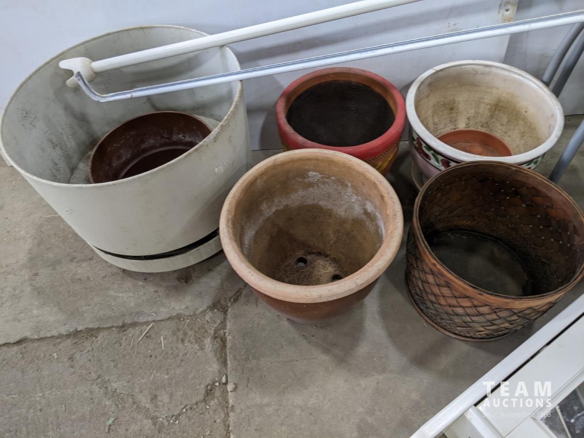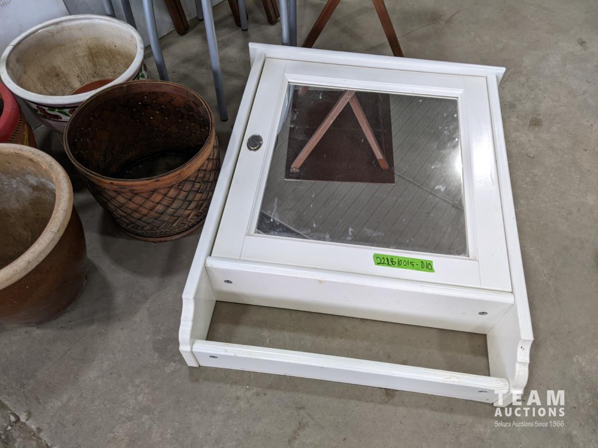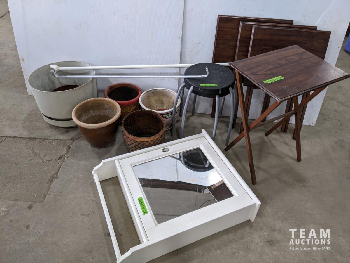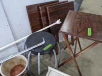 (2) stools, (2) curtain rods, medicine cabinet, (4) wooden TV trays and assortment of pots