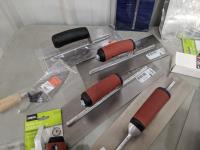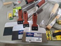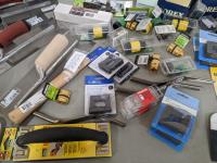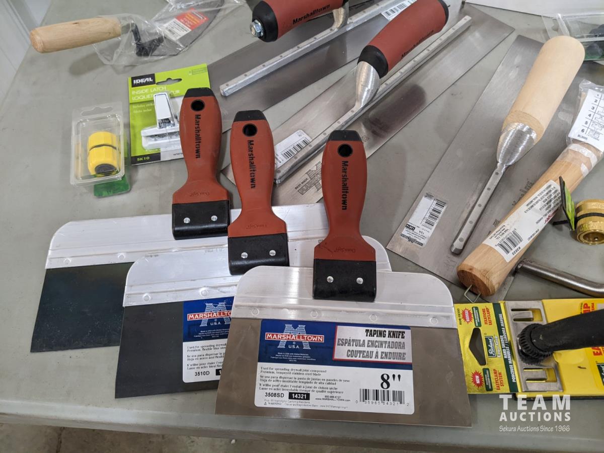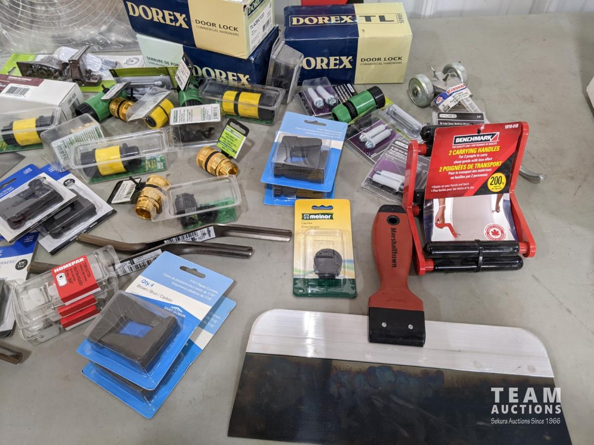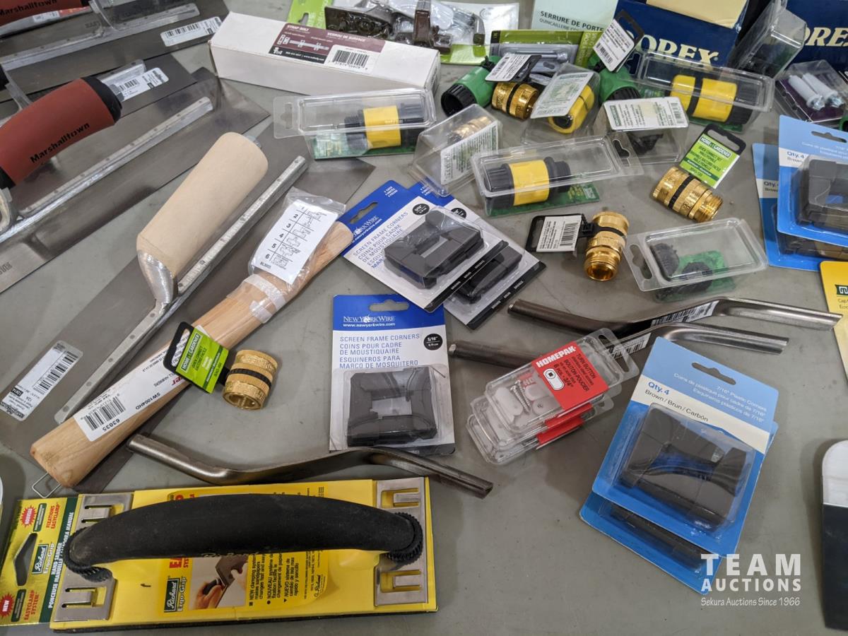 Drywall trowels, taping knives, latches, doorknobs, carrying handles, plastic corners for screens and garden hose connectors