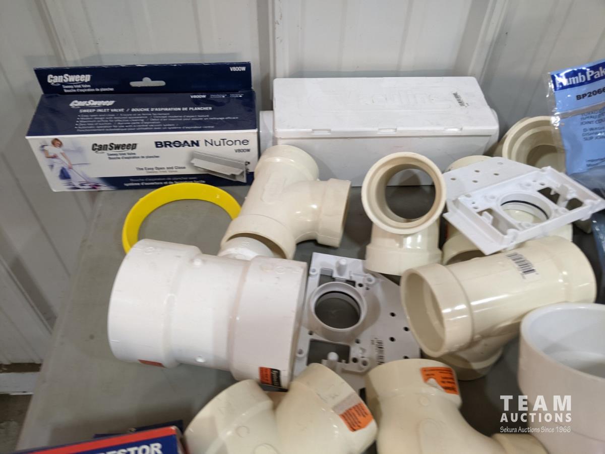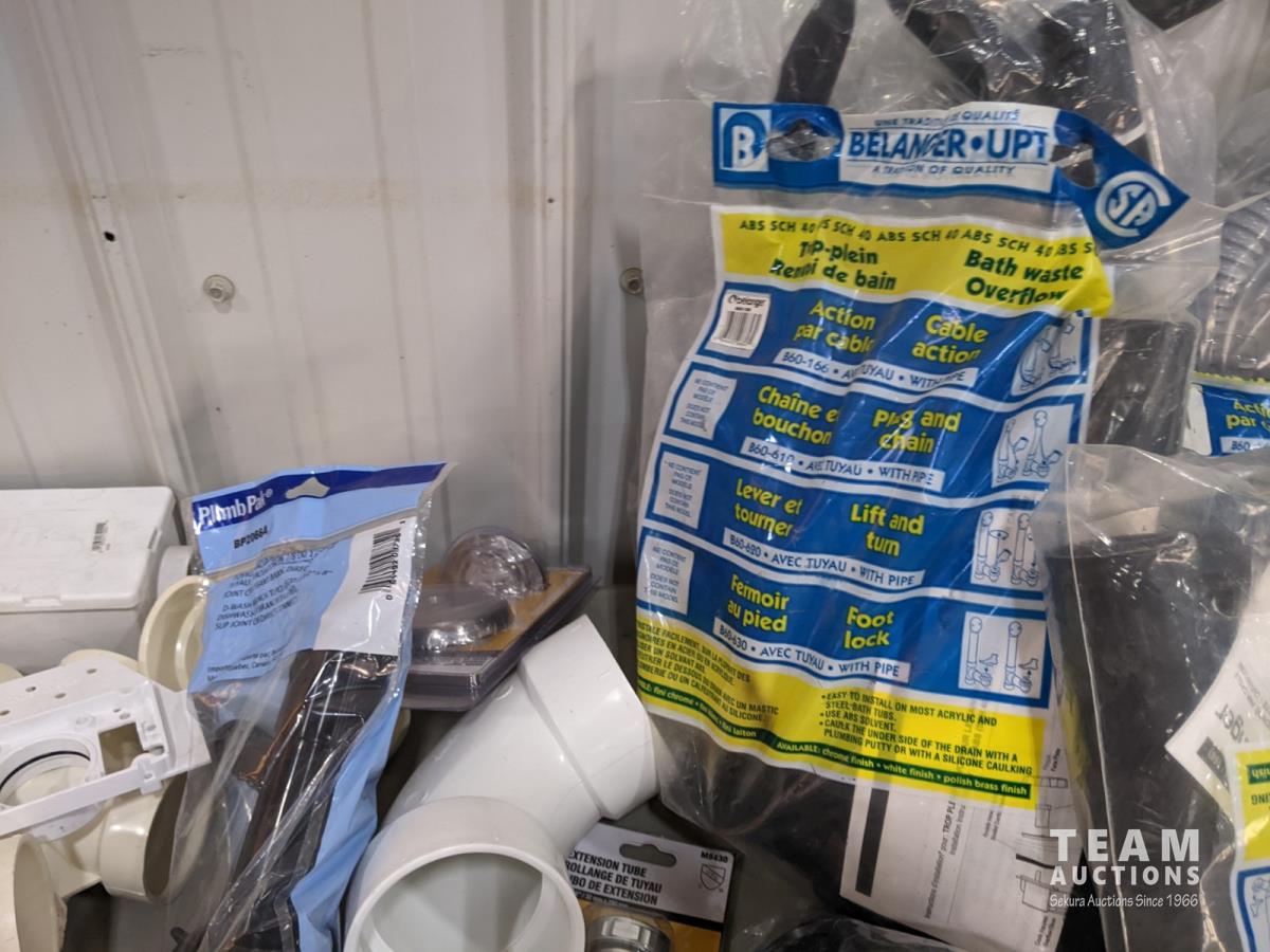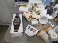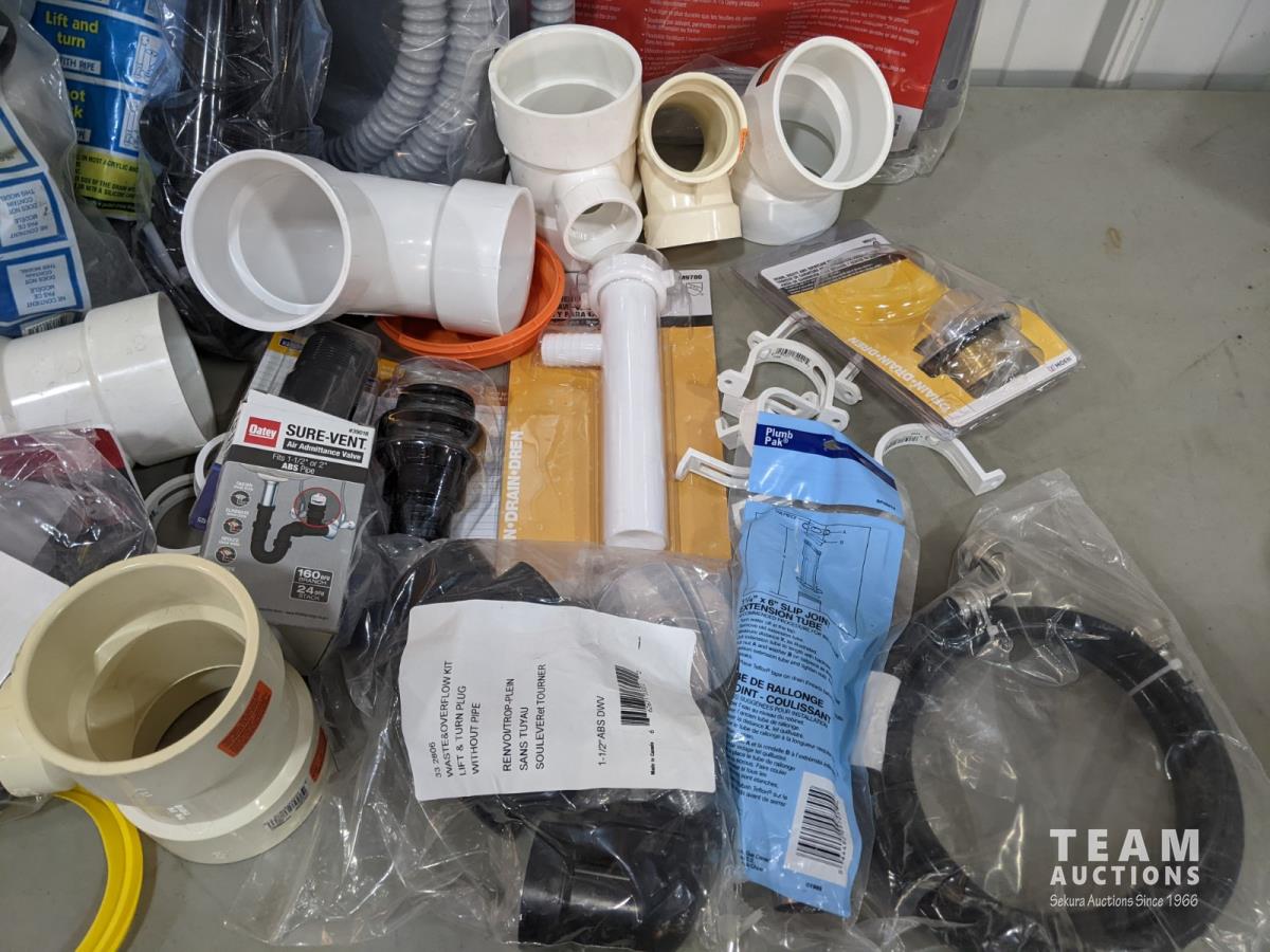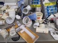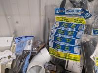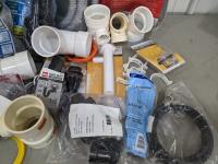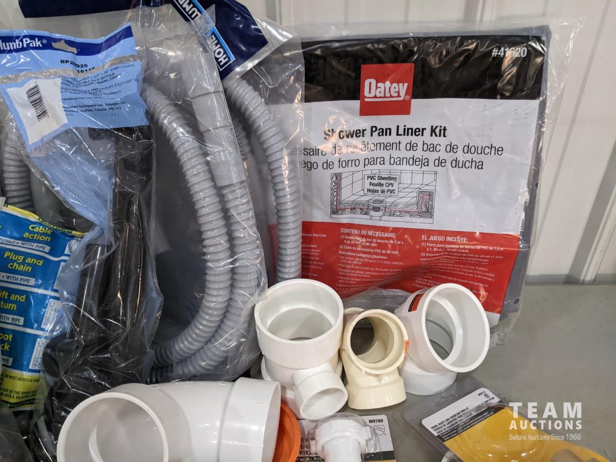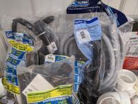 Box of plumbing supplies, shower pan line kit, bath waste over flow, extension tube and PVC laundry drain hose