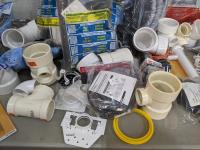 Box of plumbing supplies, shower pan line kit, bath waste over flow, extension tube and PVC laundry drain hose