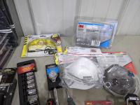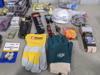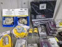 (2) pairs gloves, aprons, safety glasses, masks, 2" leather work belt, hose connectors, pocket door hardware and door hardware