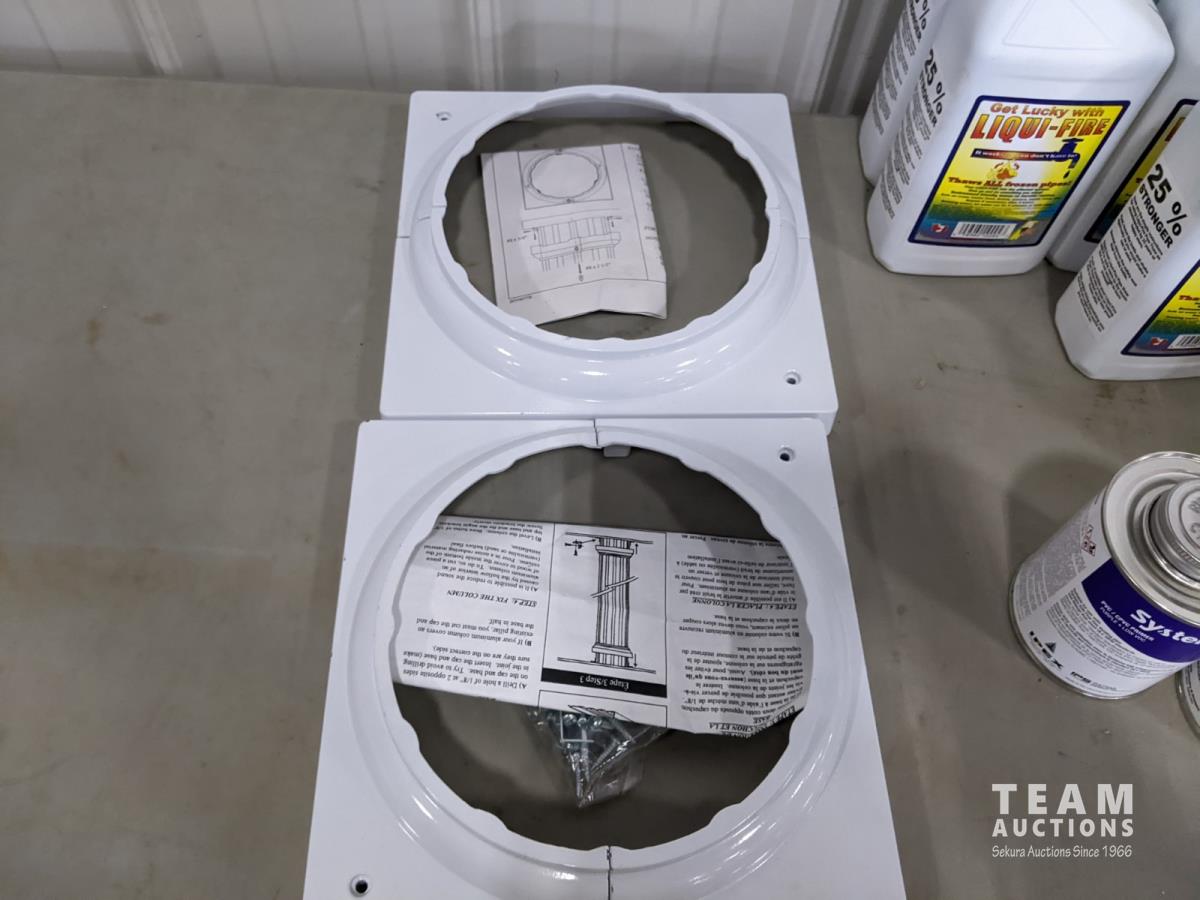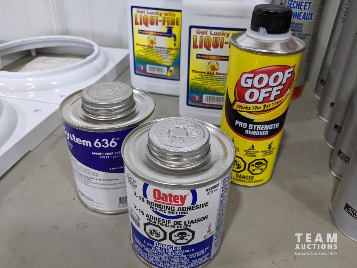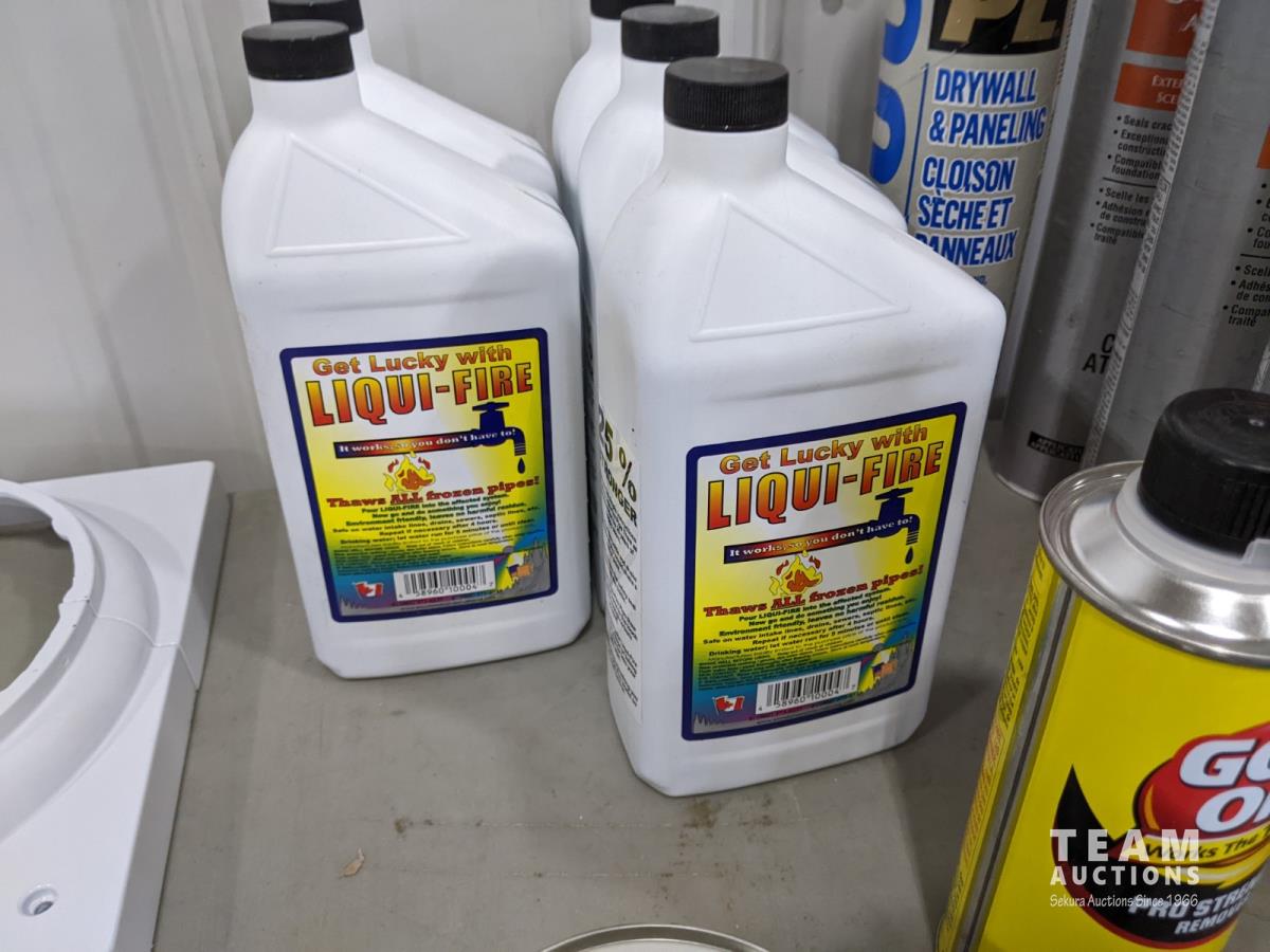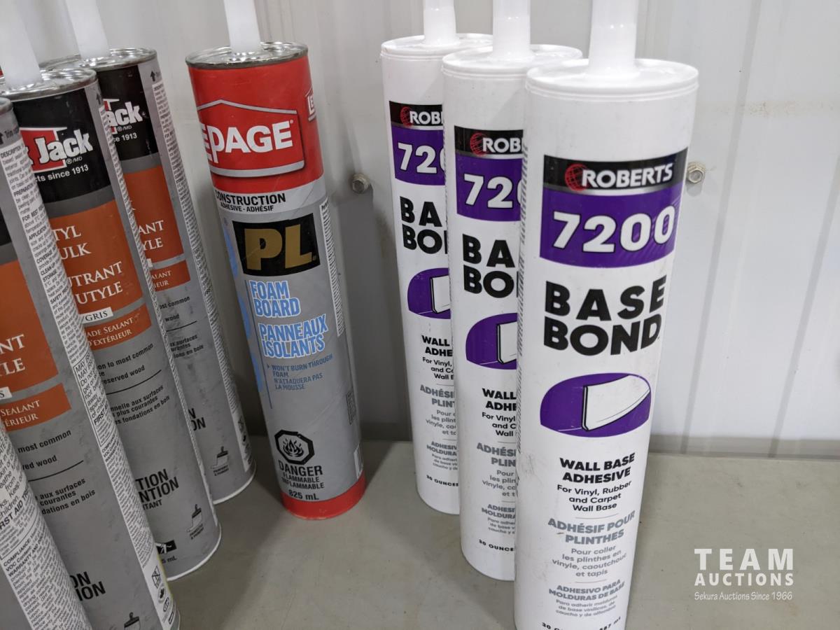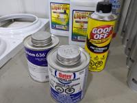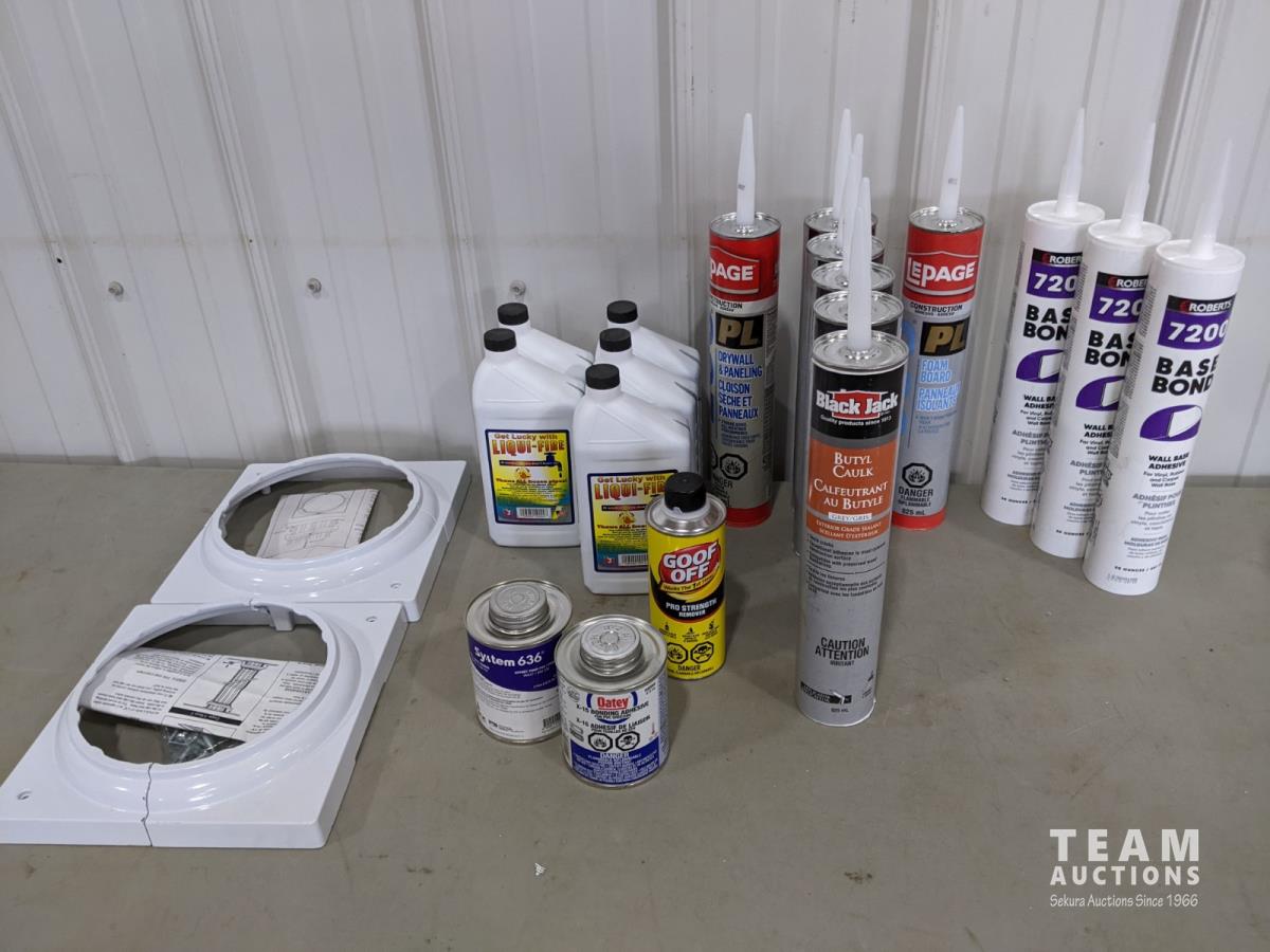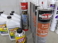 Box of liqui-fire, wall base adhesive, goof off, drywall paneling caulking, caulking, bonding adhesive and metal pillar bases