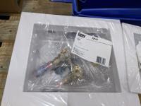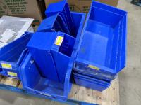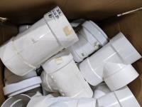 Pallet with organization bins, box of assorted plumbing, PVC connectors and plastic tap boxes