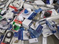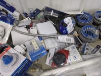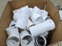 Pallet with organization bins, box of assorted plumbing, PVC connectors and plastic tap boxes