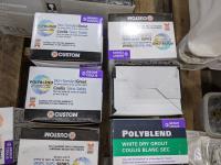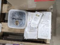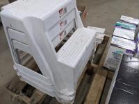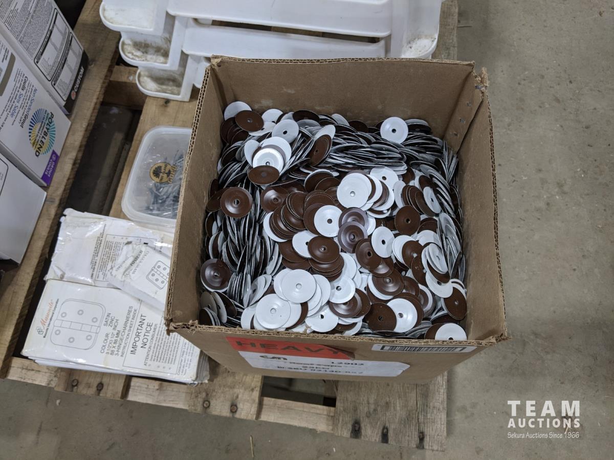(3) Step stools, box of tin washers, hinges, light fixtures, mortar and grout