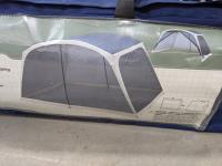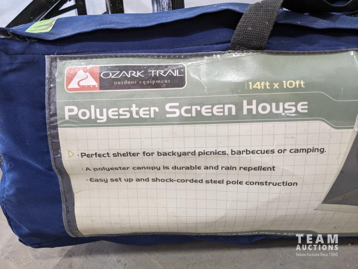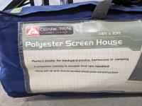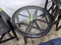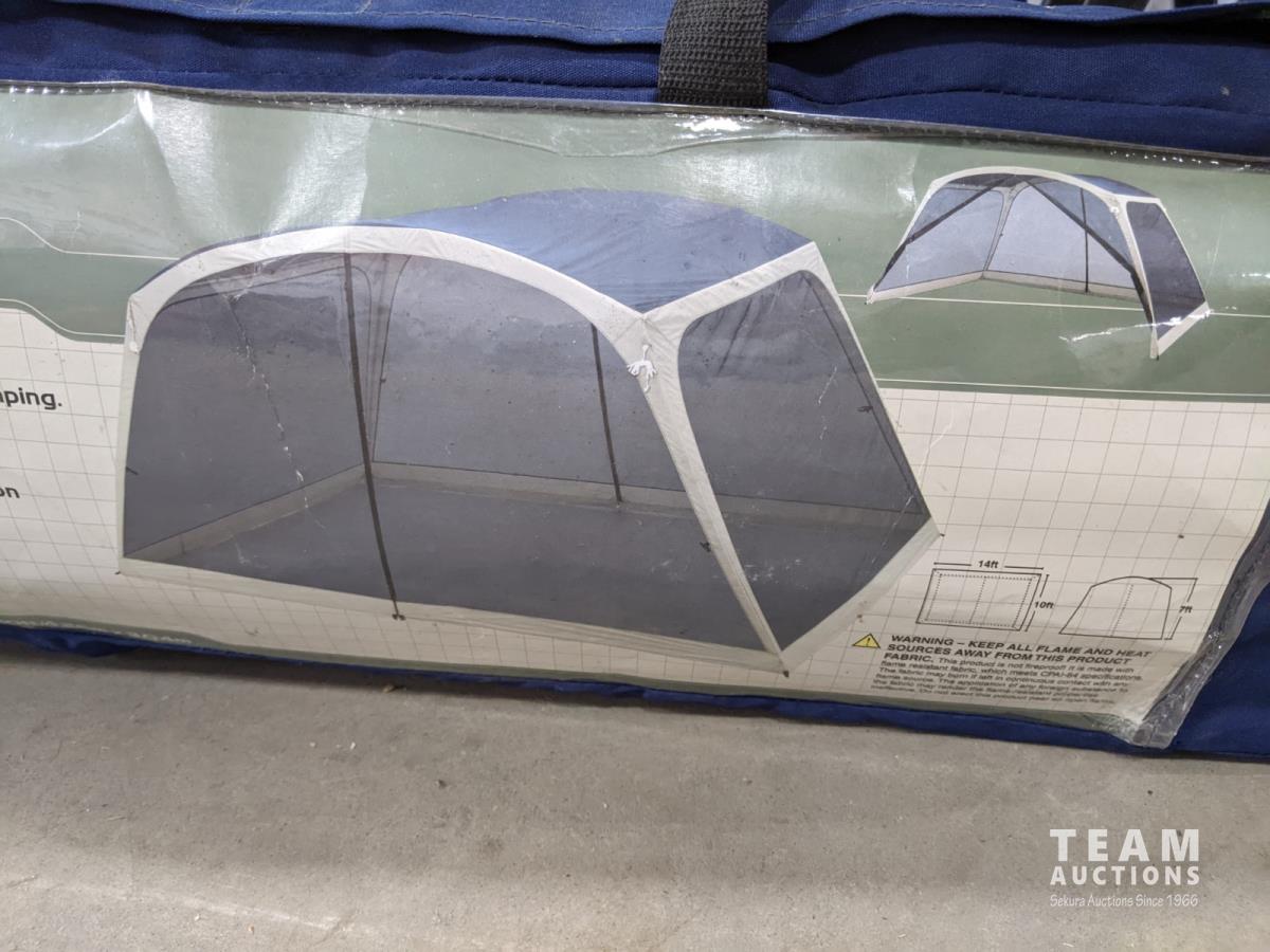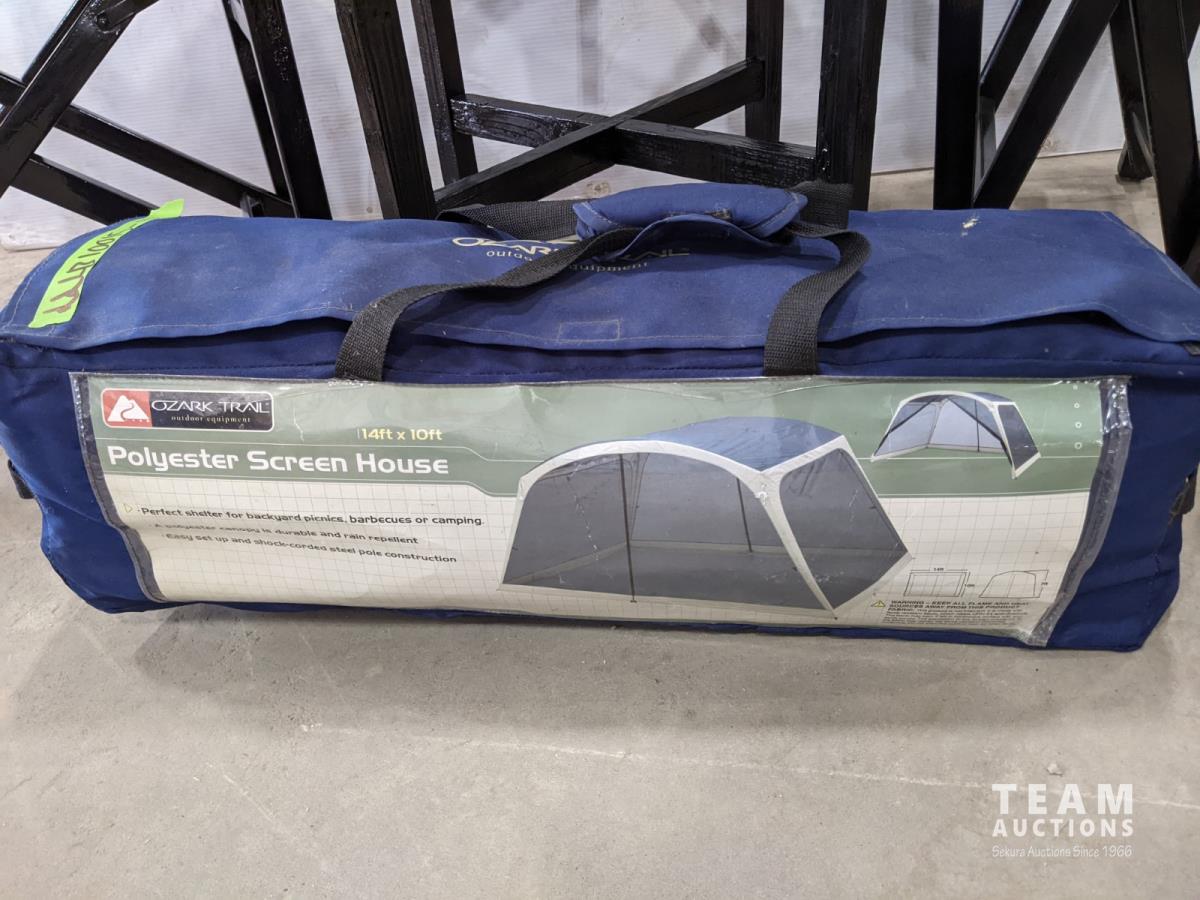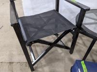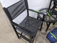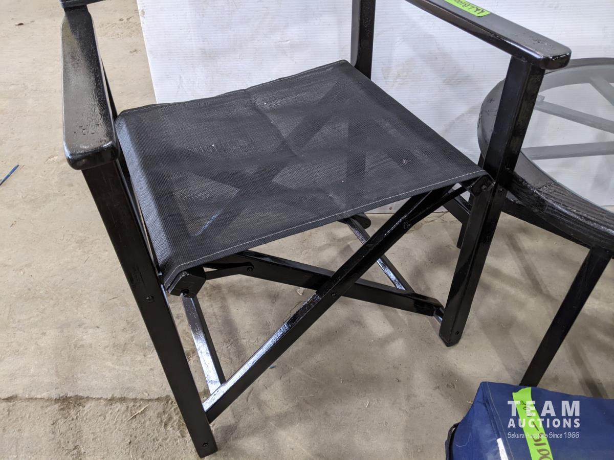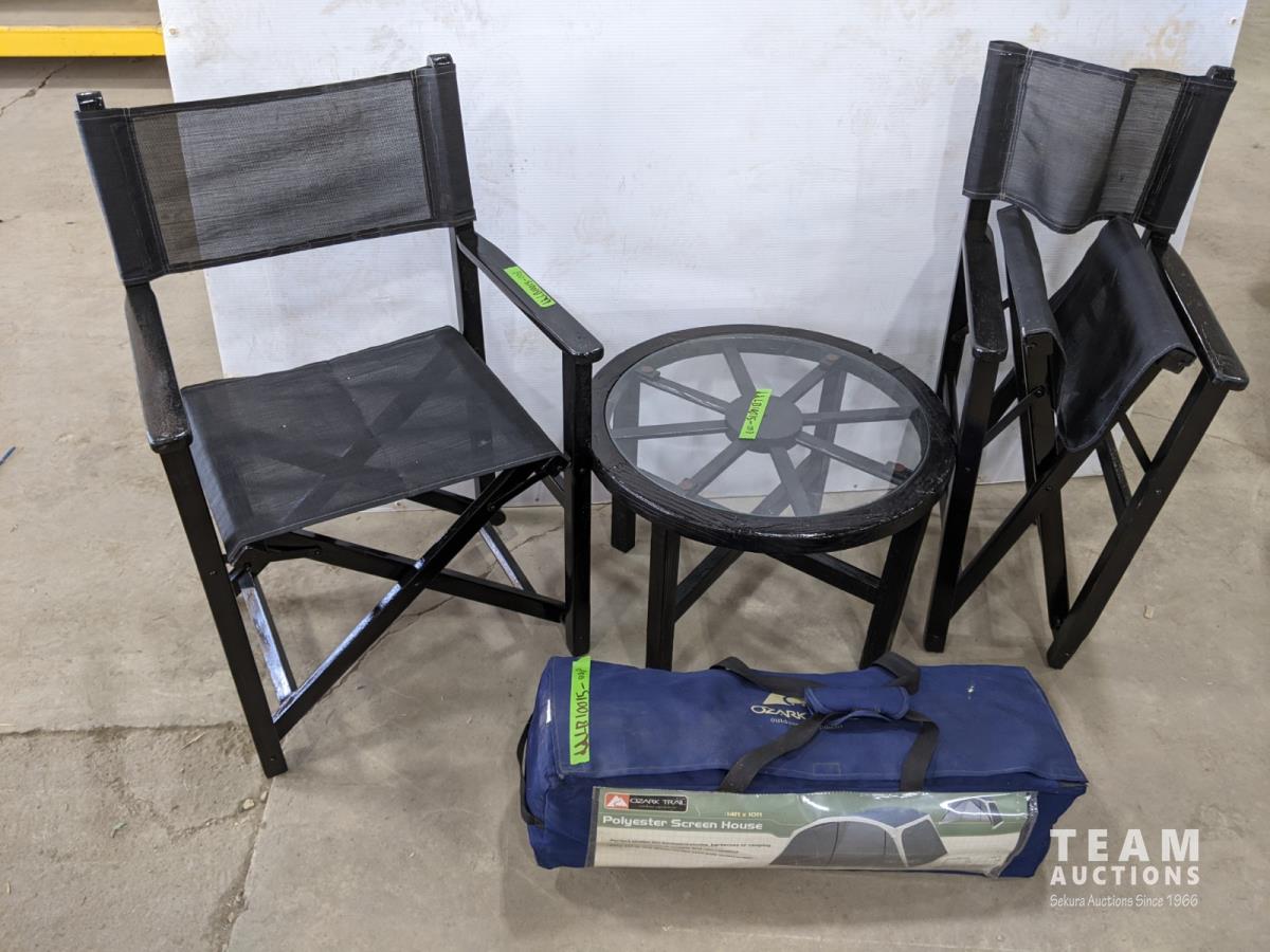 (2) black folding lawn chairs, wagon wheel table and 10 ft x 14 ft screen house