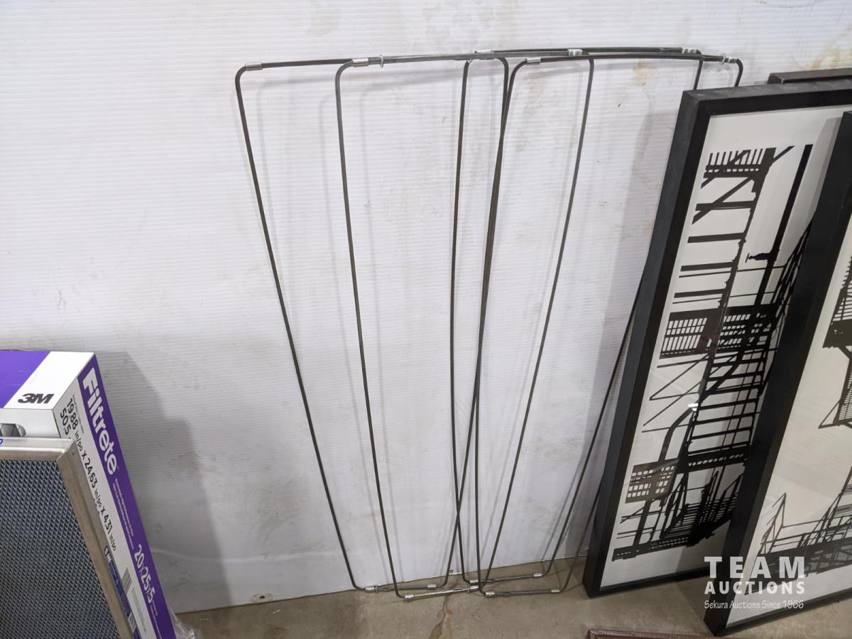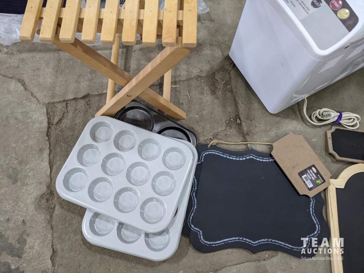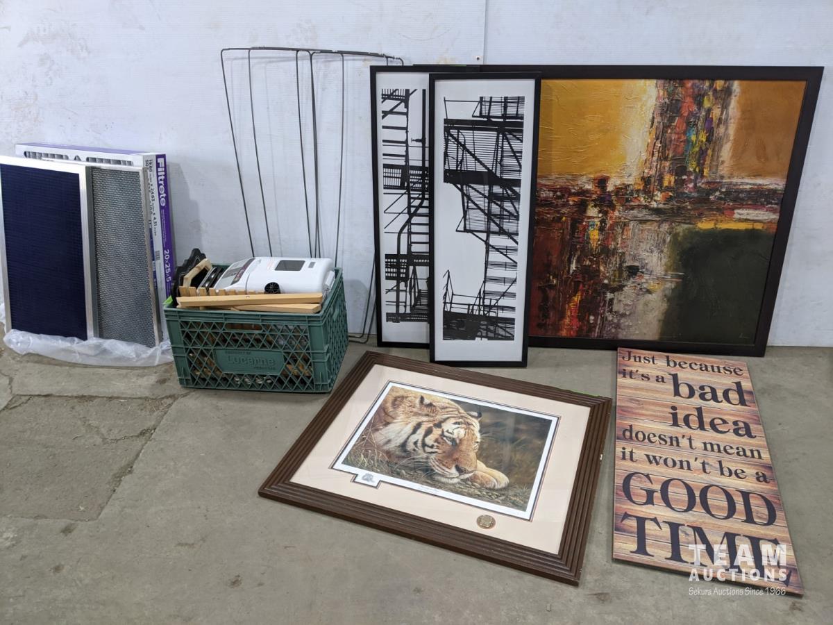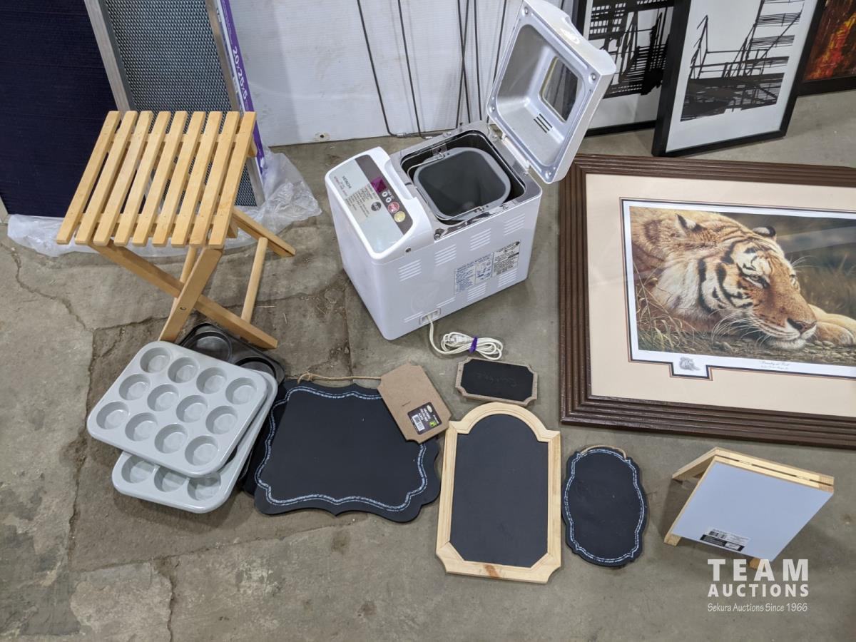 Bread maker, small wooden folding plant stand, (5) chalkboard signs (various sizes), (4) muffin tins, (3) furnace filters (various sizes), (4) pant hangers and (5) large art/decor pictures