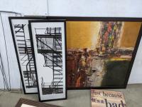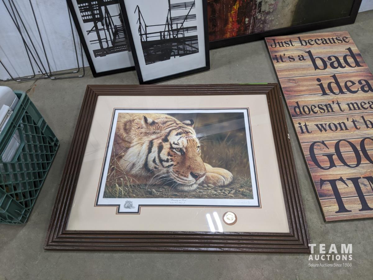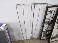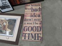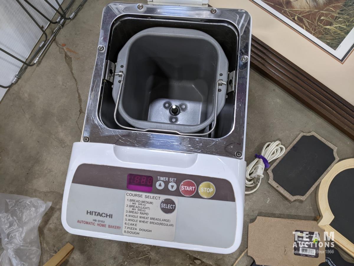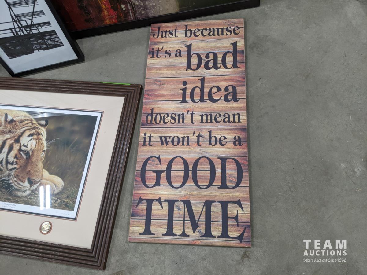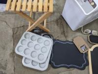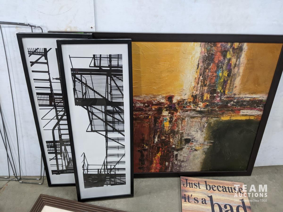 Bread maker, small wooden folding plant stand, (5) chalkboard signs (various sizes), (4) muffin tins, (3) furnace filters (various sizes), (4) pant hangers and (5) large art/decor pictures