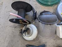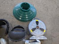 Face shield, tree stands, toy car holder, hose reel, remote vehicle starter, light fixture and pair of gloves