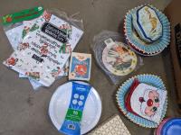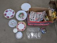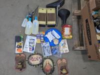Assortment of household items, dishes, wall hangings, bike seats, surge protectors, etc.