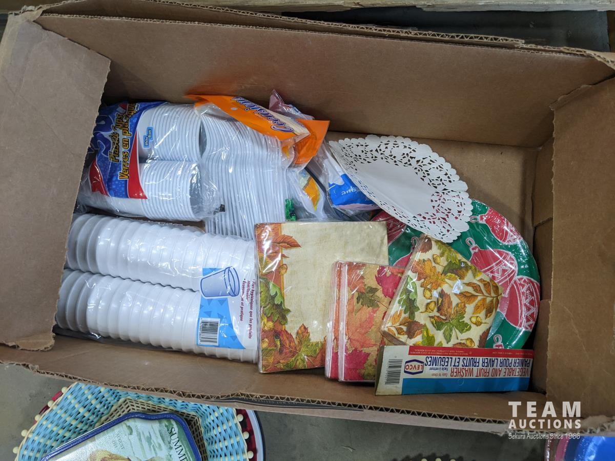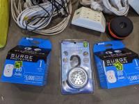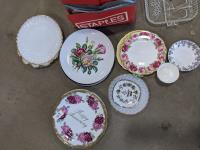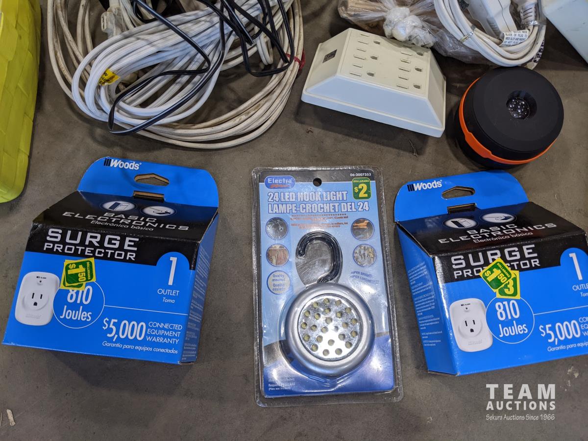 Assortment of household items, dishes, wall hangings, bike seats, surge protectors, etc.