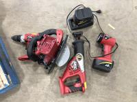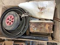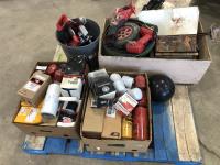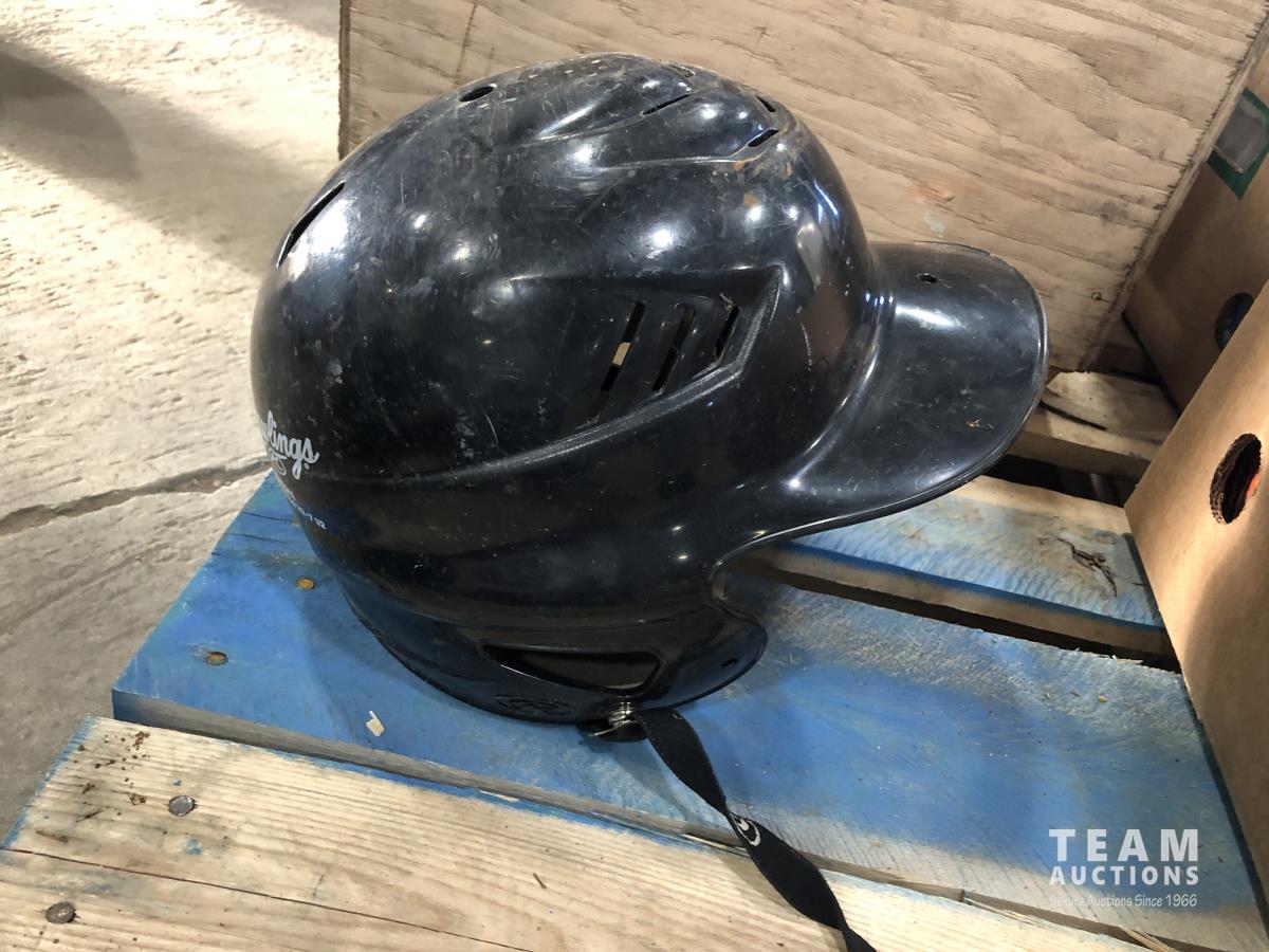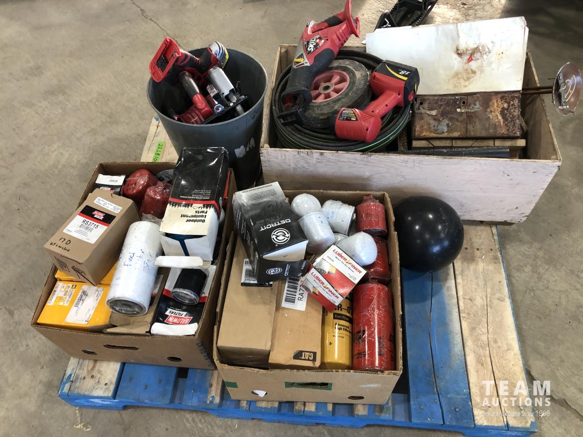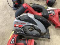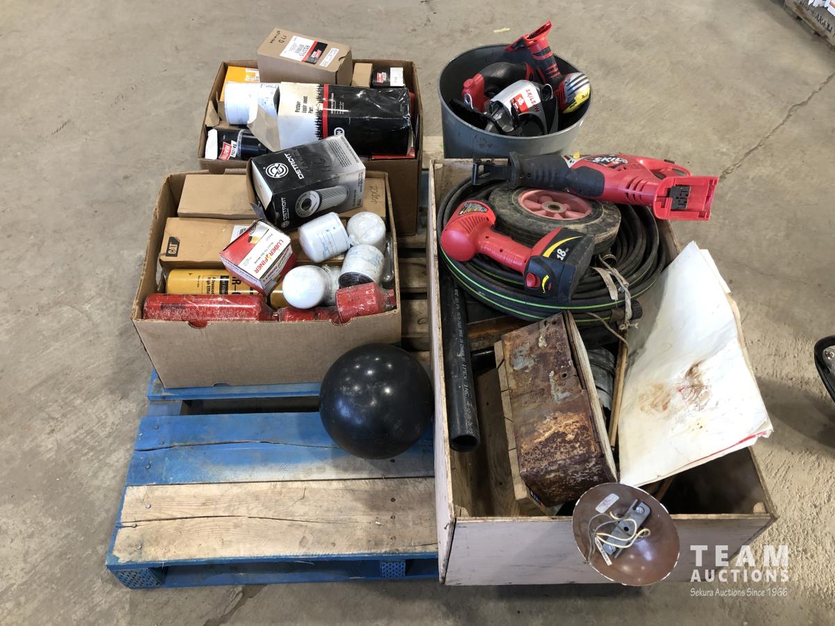 18 volt Skilsaws, Skilsaw flashlight with battery and charger, baseball helmets, assorted filters, bowling ball and hoses