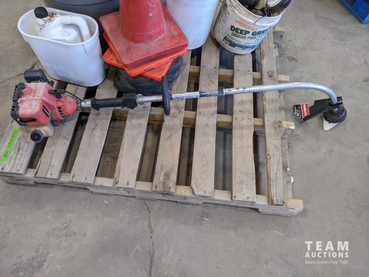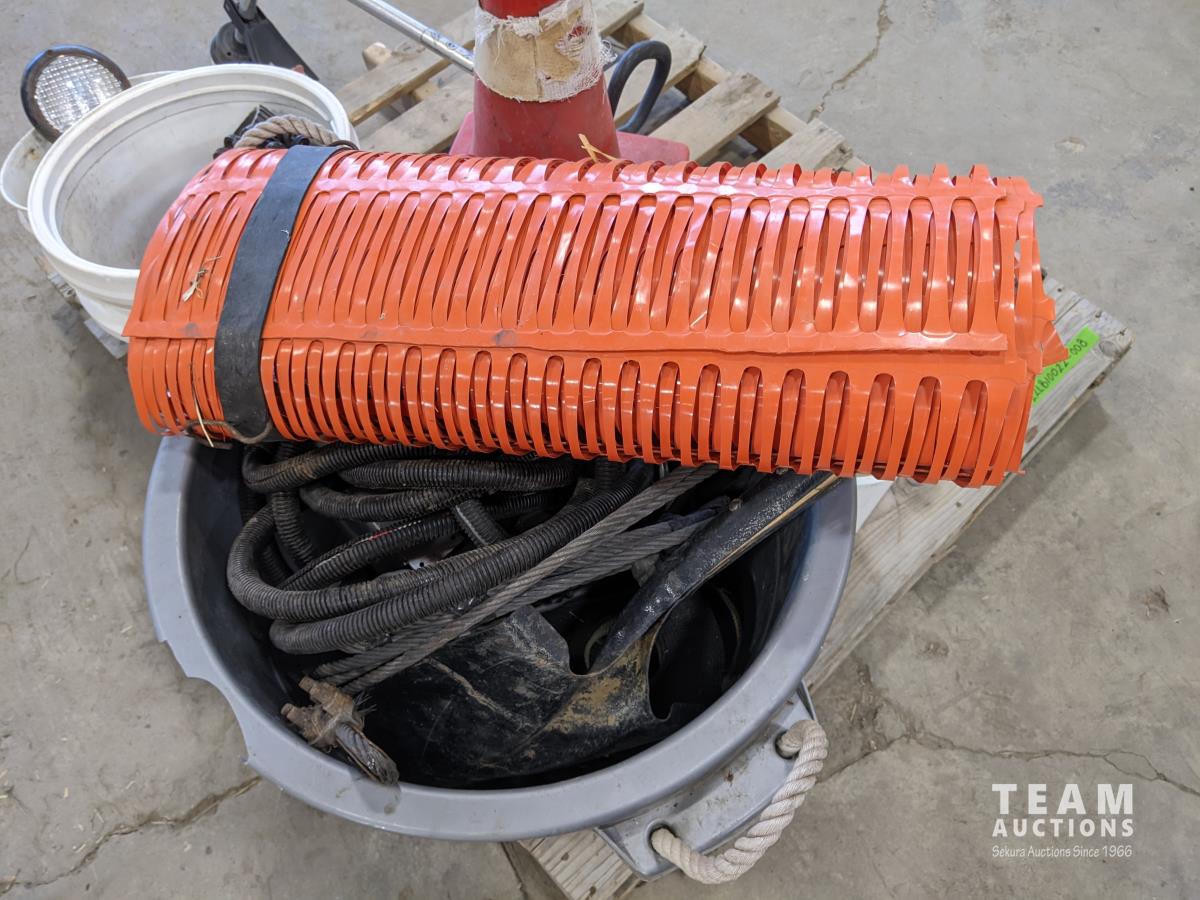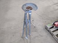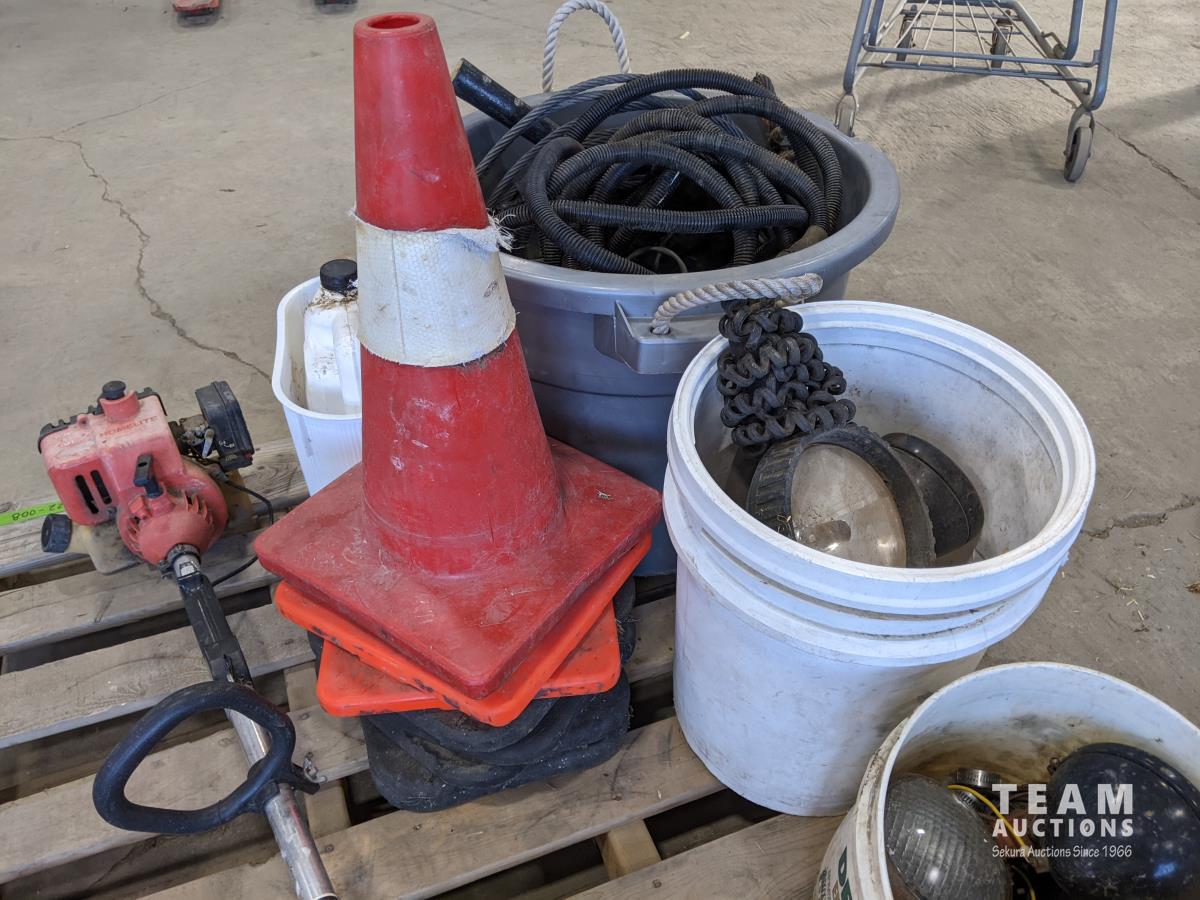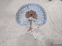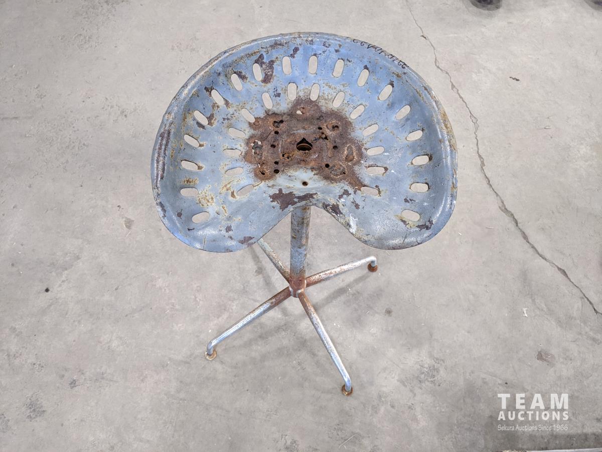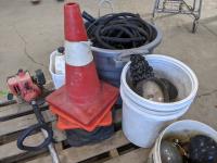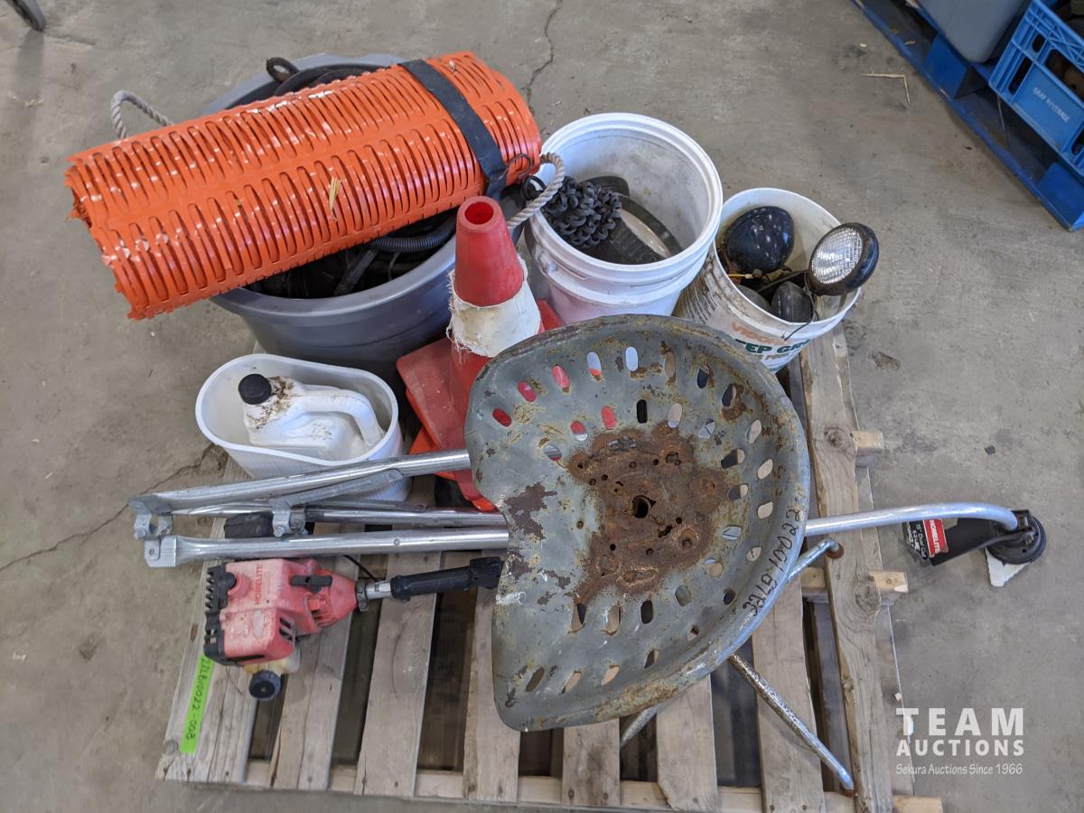 Antique tractor seat stool, tripod, grass trimmer, snow fence, cables, lights and construction cones