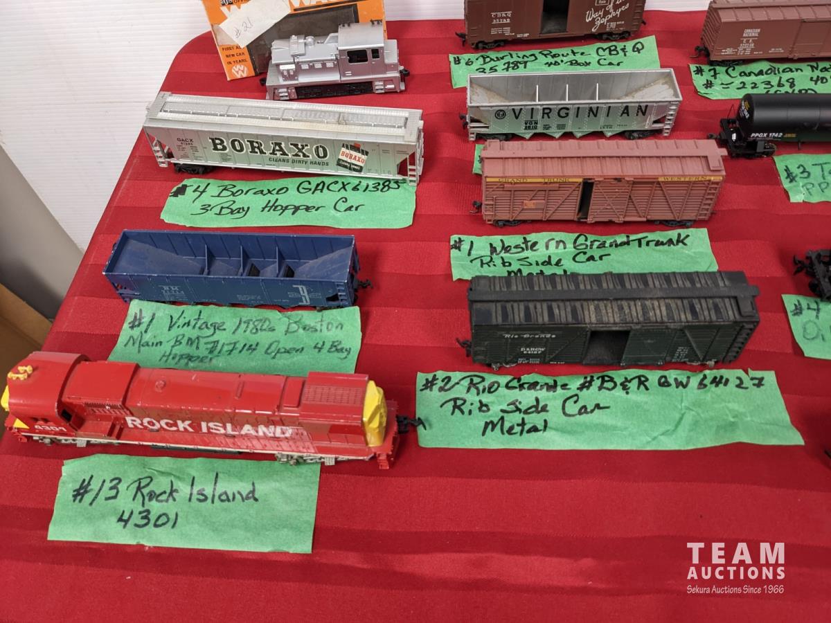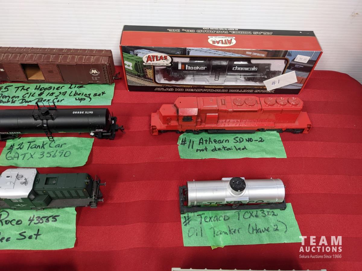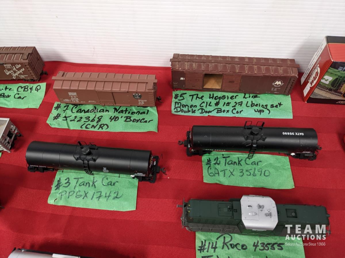 Assortment of train cars, tanks, side and hopper cars