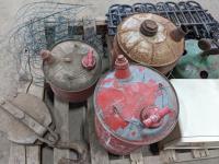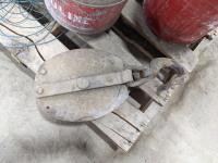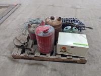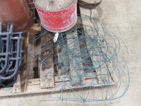 (3) antique Jerry cans, bread box, qty of garden edge fencing, sewer snake, snatch block