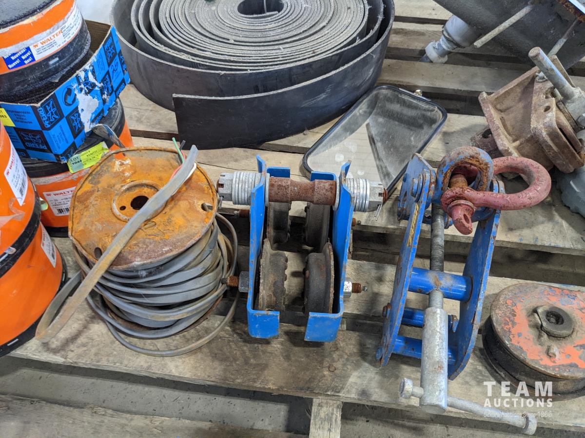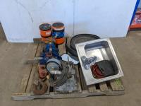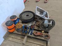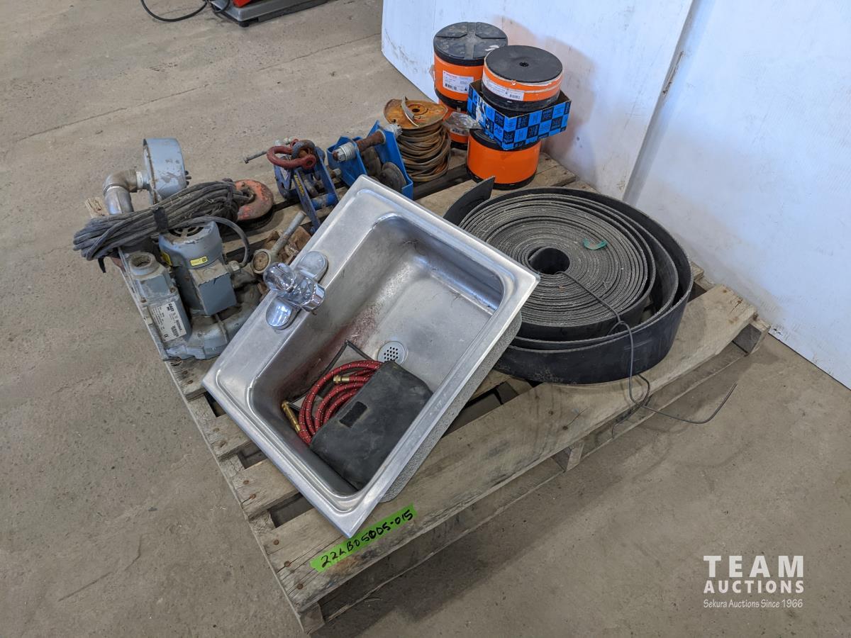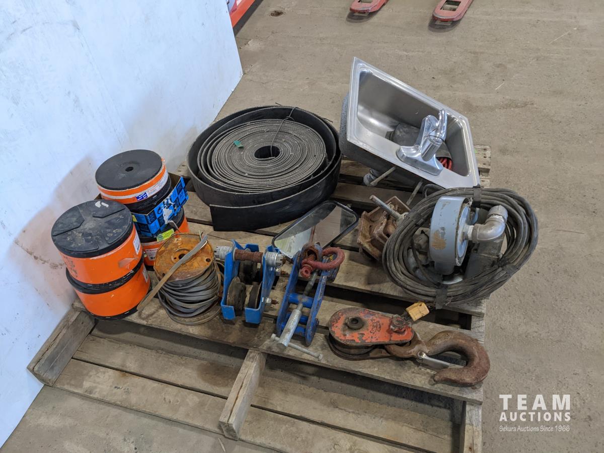 Small stainlees sink, qty of 7 inch grinding discs, roll of belting, electric air pump, pulley with hook, track dolly, track lift hook