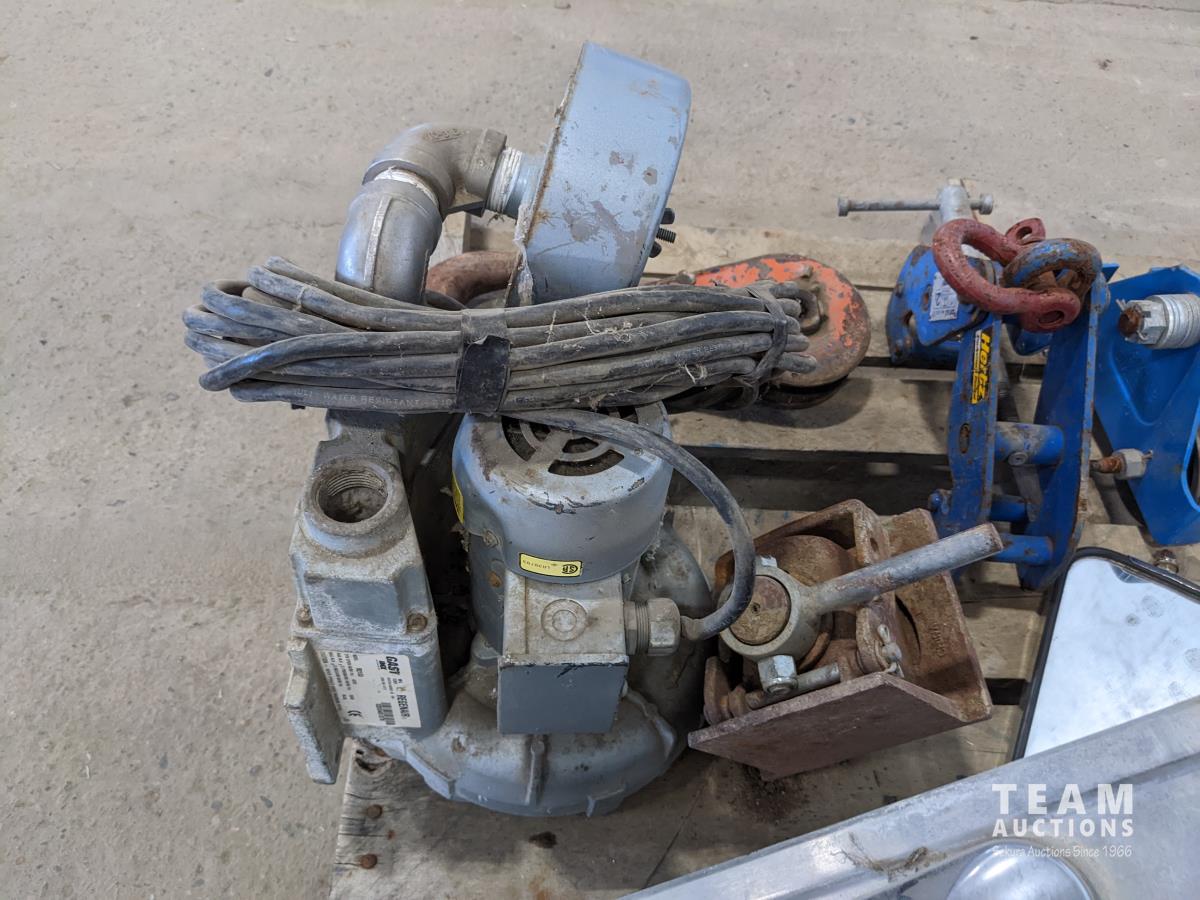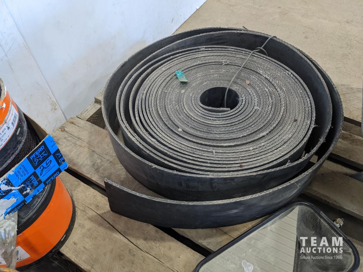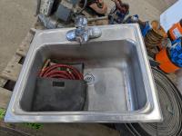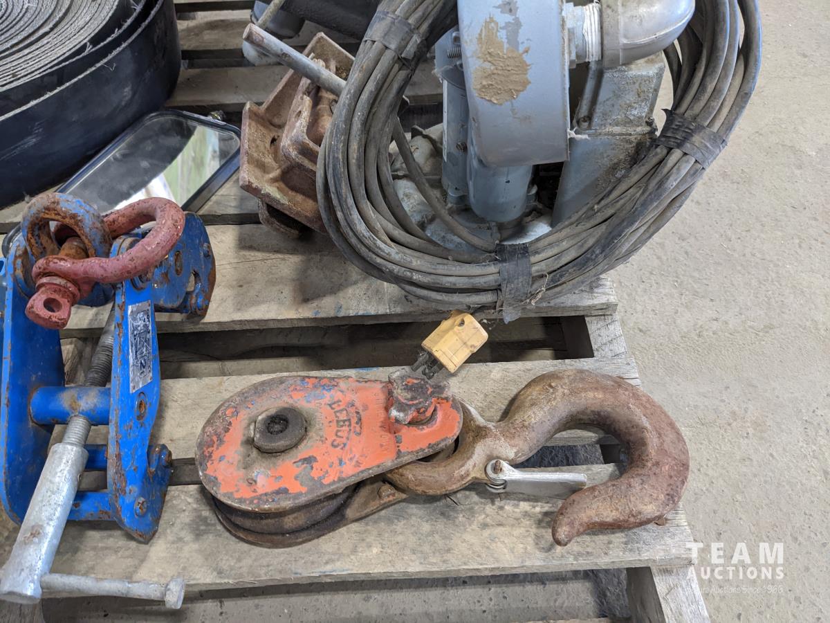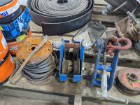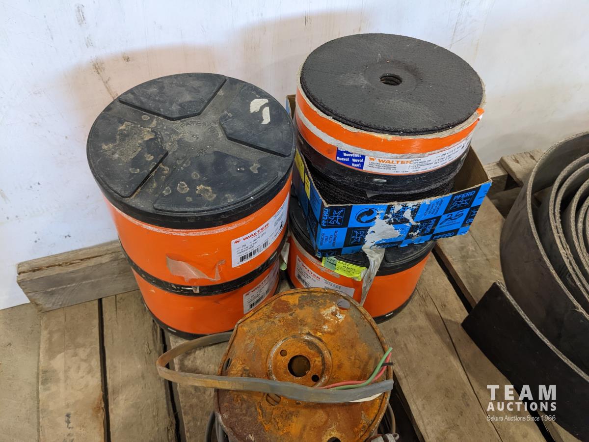 Small stainlees sink, qty of 7 inch grinding discs, roll of belting, electric air pump, pulley with hook, track dolly, track lift hook