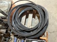 Qty of bike tires, band saw blades, metric and standard stubby wrenches, small drill press, miscellaneous items, box of chrome wheel nut covers
