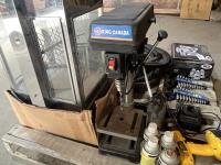 Qty of bike tires, band saw blades, metric and standard stubby wrenches, small drill press, miscellaneous items, box of chrome wheel nut covers