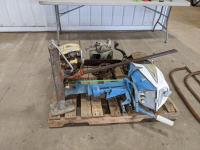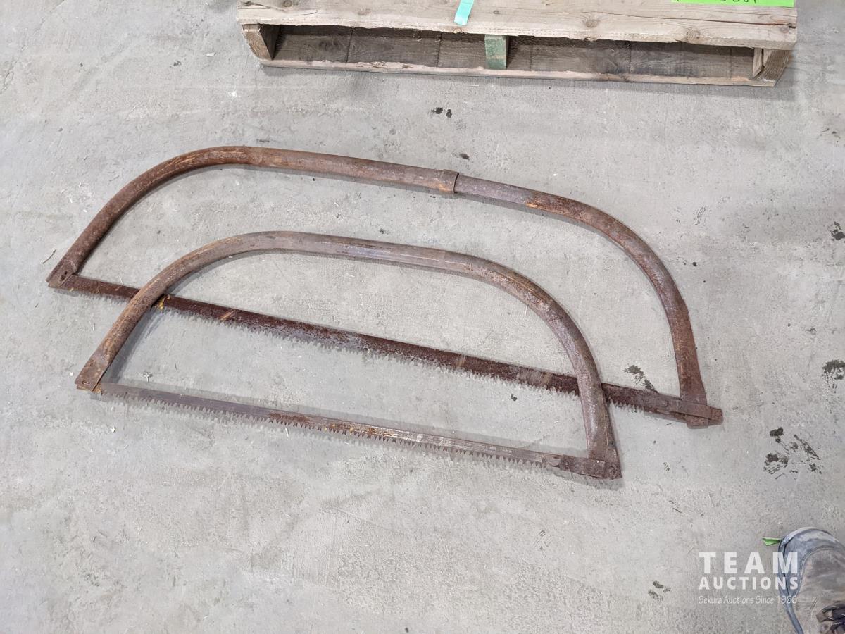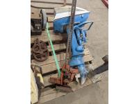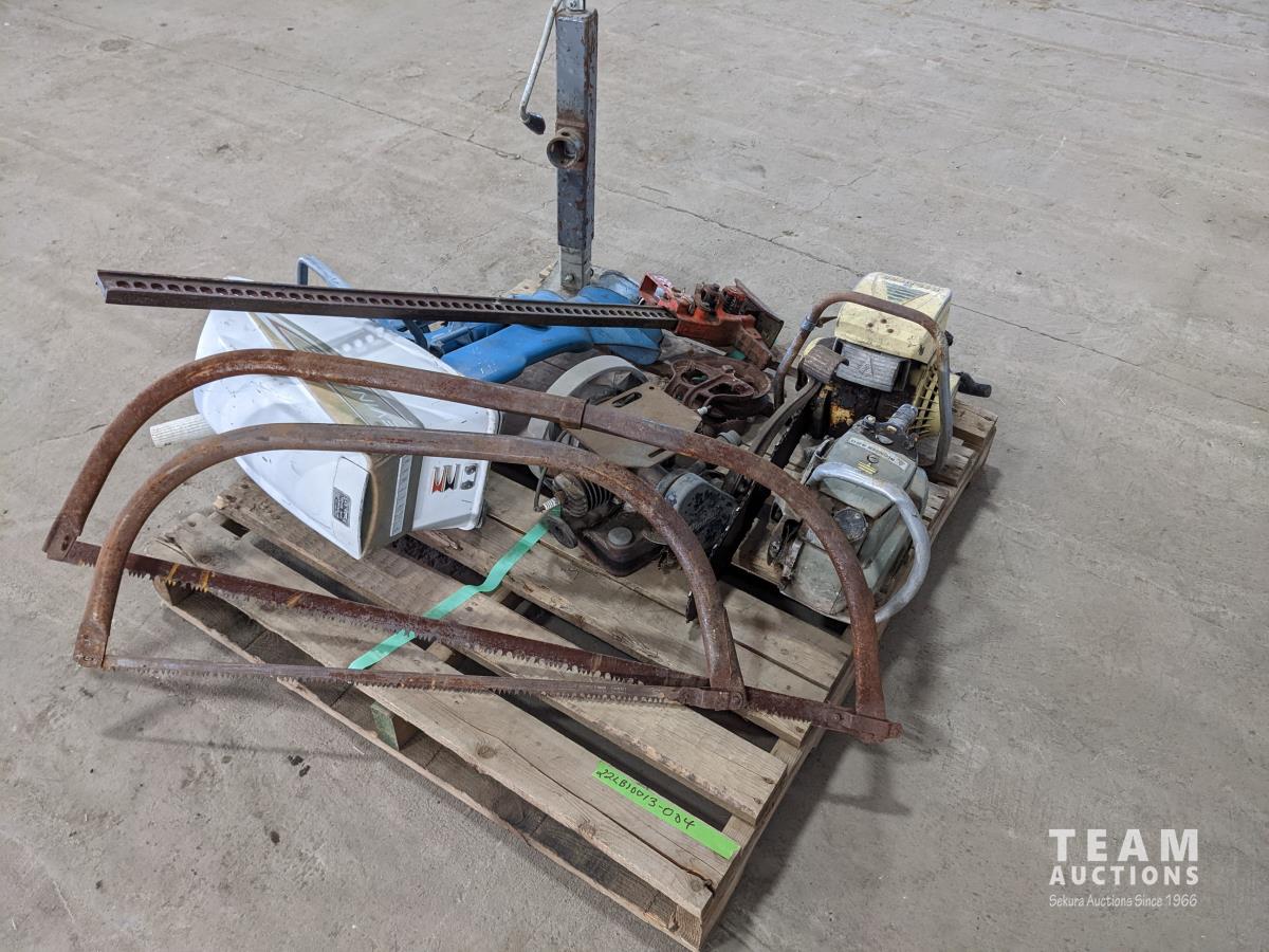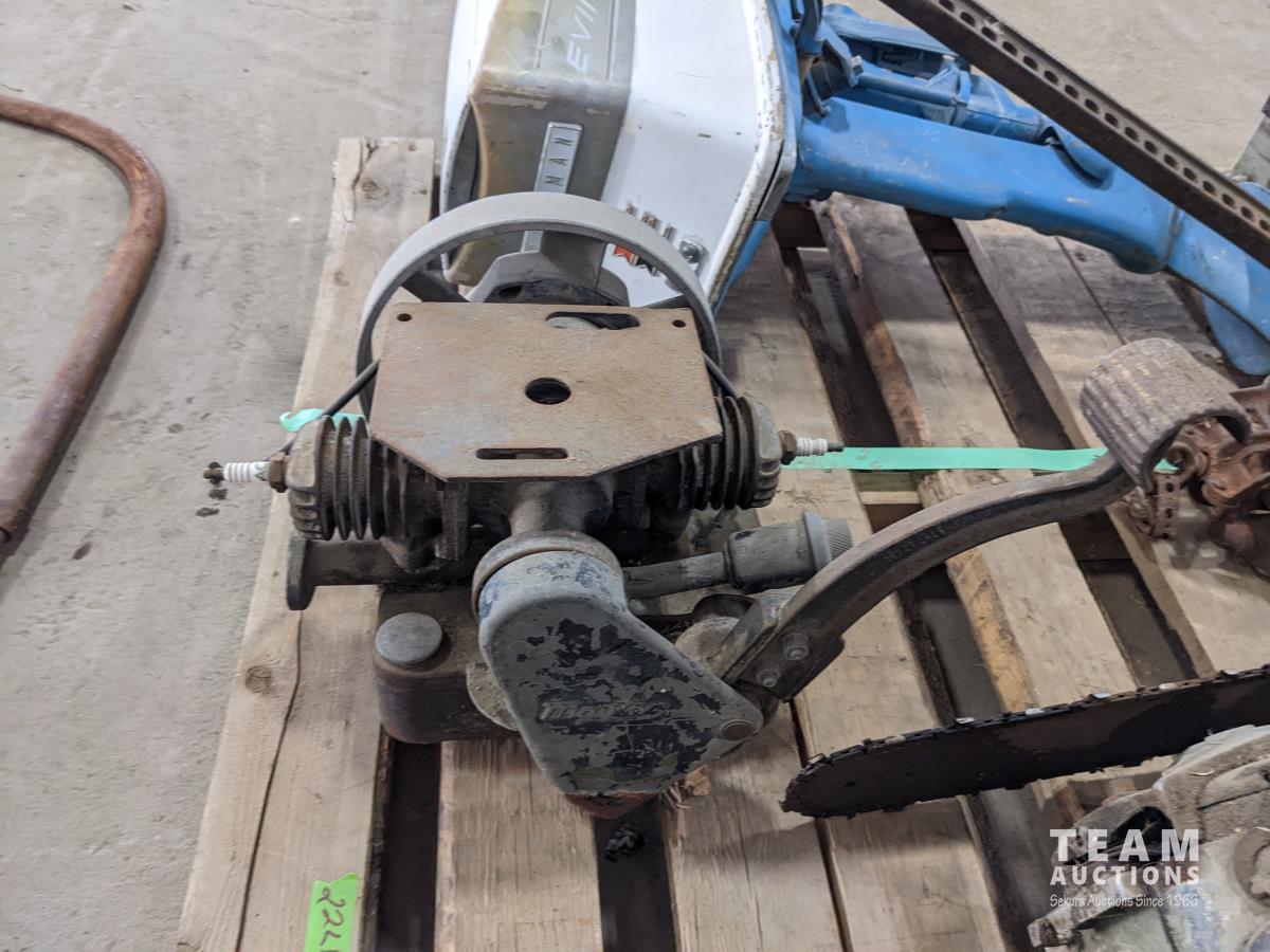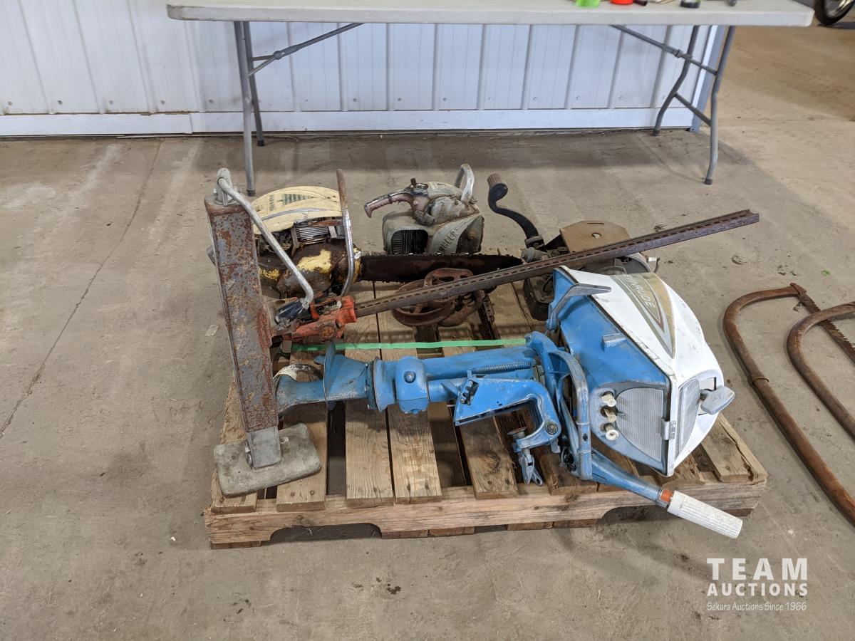 (2) Antique chain saws, Evinrude outboard (inoperable), (2) cross cut saws, Small antique engine, (2) jacks