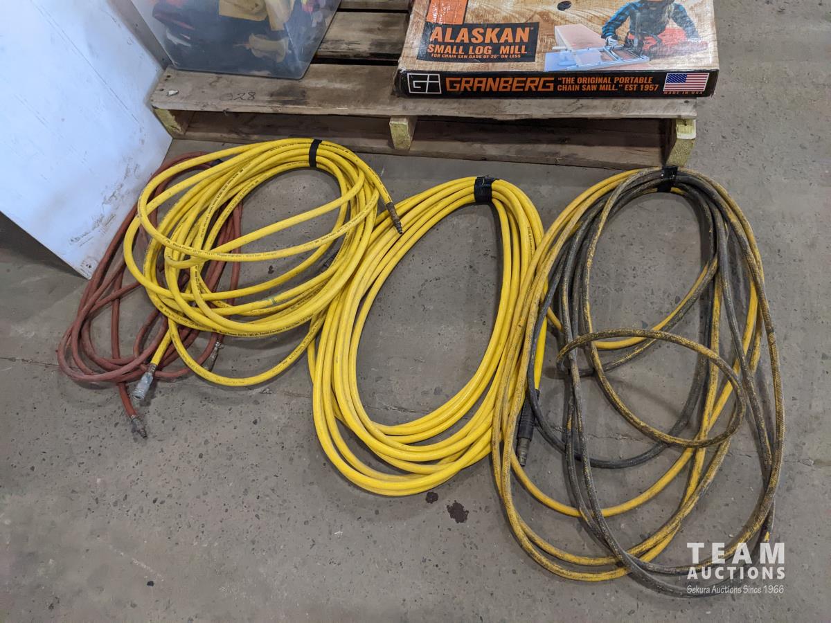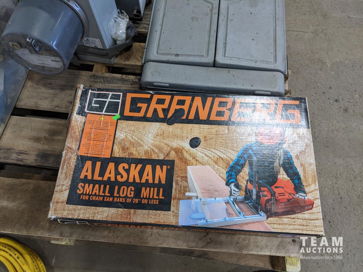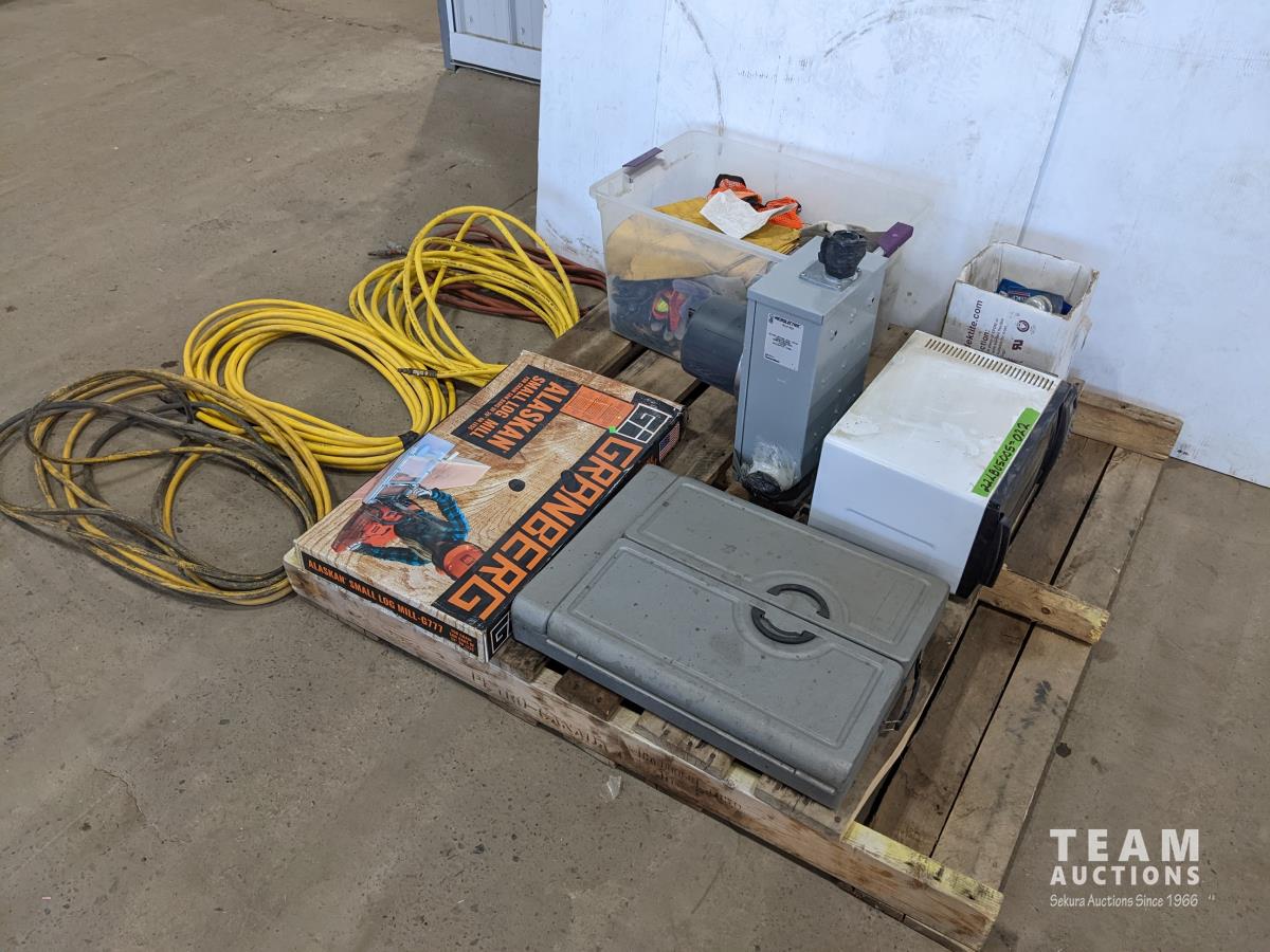 (4) Air hoses, Alaskan small log mill, partial tool kit, box of bearings, gloves and rain gear, electrical meter box