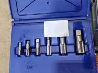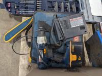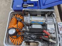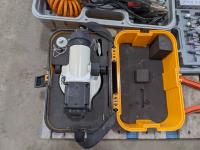 Tubing cutter, bit set, wrenches, Ryobi 18V cordless drill, digital scale, Irwin pipe tap set, 12V air compressor, transit level