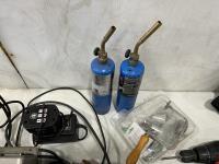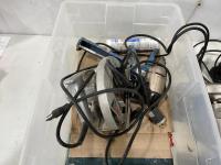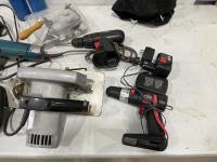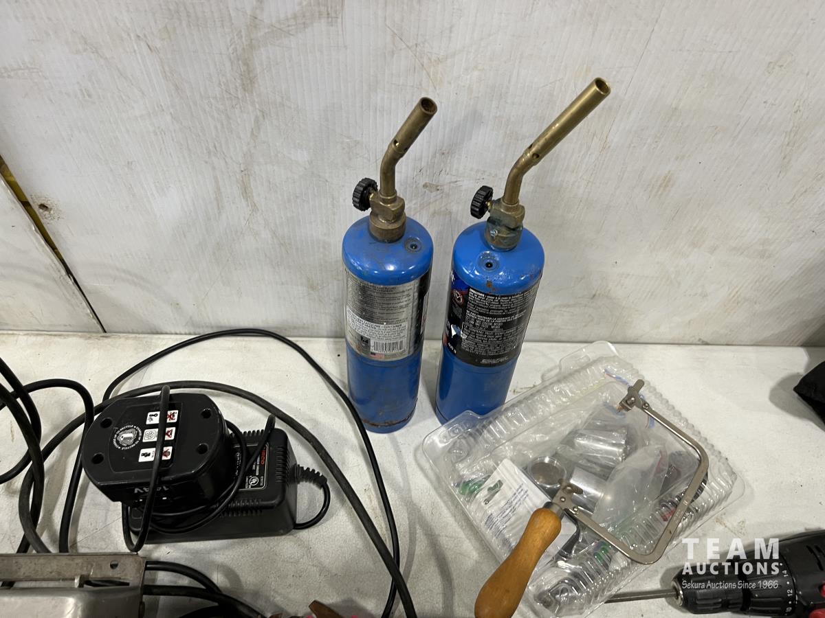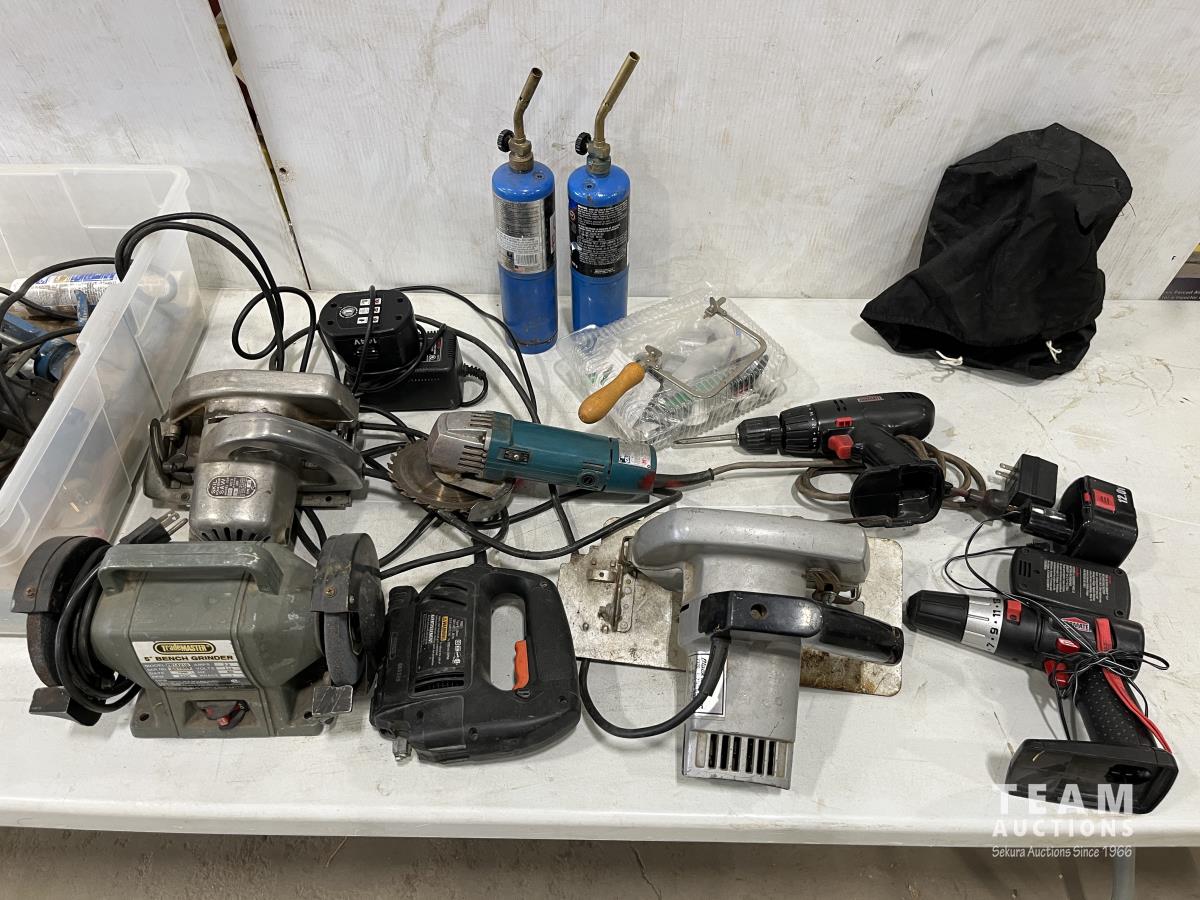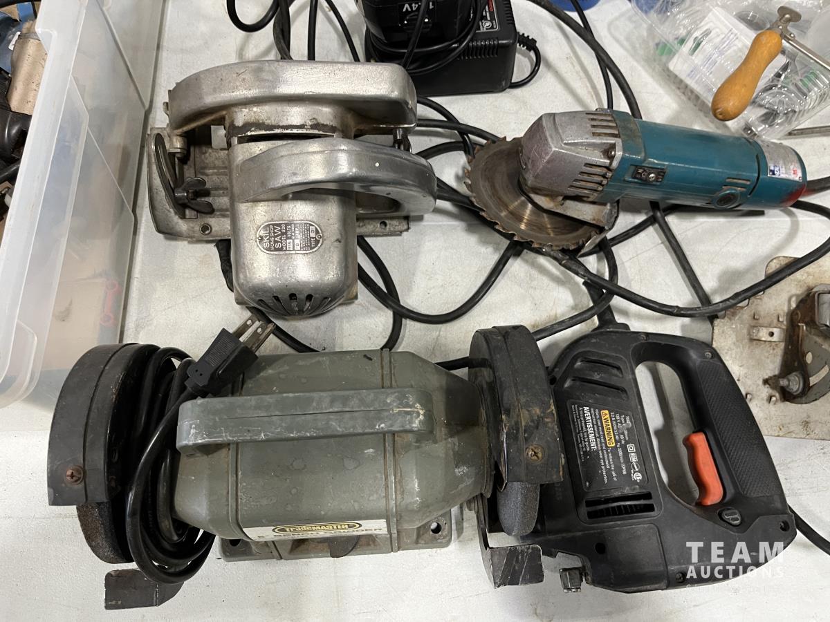 Skill saws, electric drill, 5 inch bench grinder, jig saw, angle grinder, cordless drill, (2) small torches
