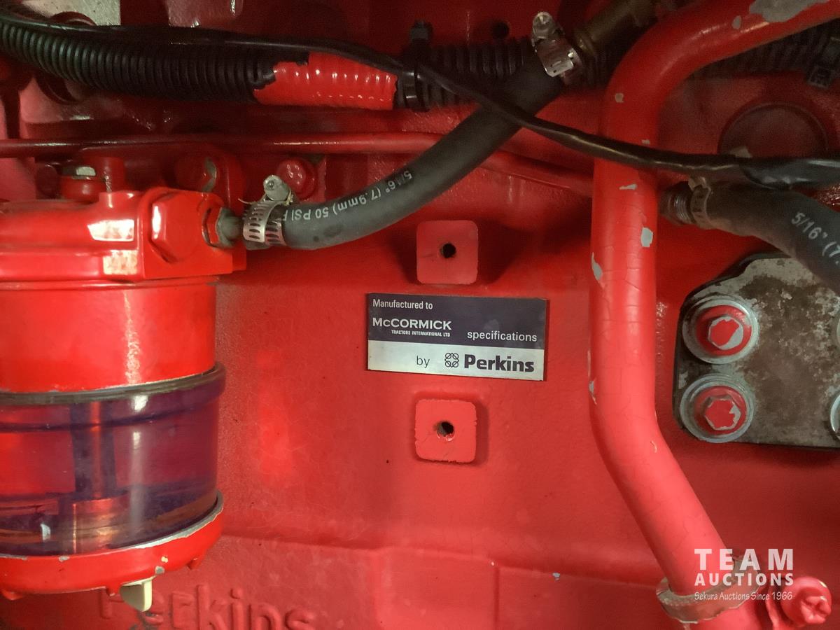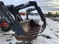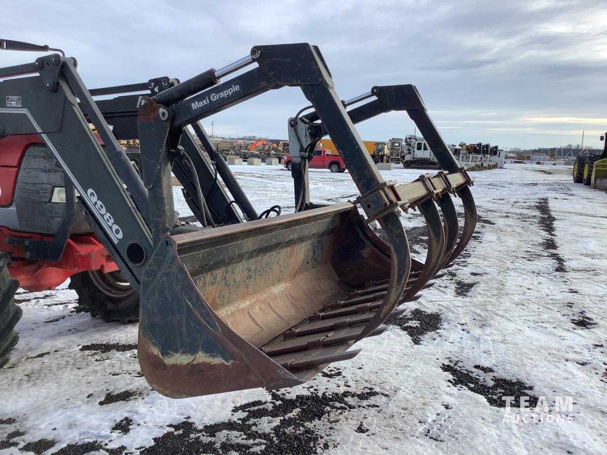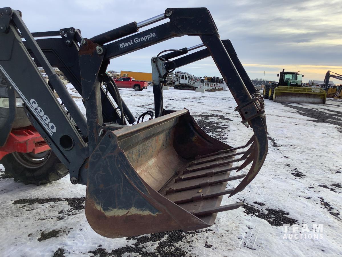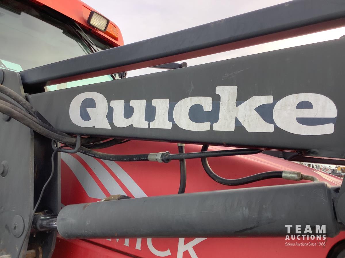 Quicke G980 self leveling loader, Q/A, 84 inch bucket, grapple, Perkins 6 L 116 HP diesel engine, 16 speed partial power shift transmission, left hand reverser, cab, joystick, 540 / 1000 PTO, 3 point hitch, 3 rear hydraulic remotes, 420/70R28 front tires, 18.4X38 rear tires