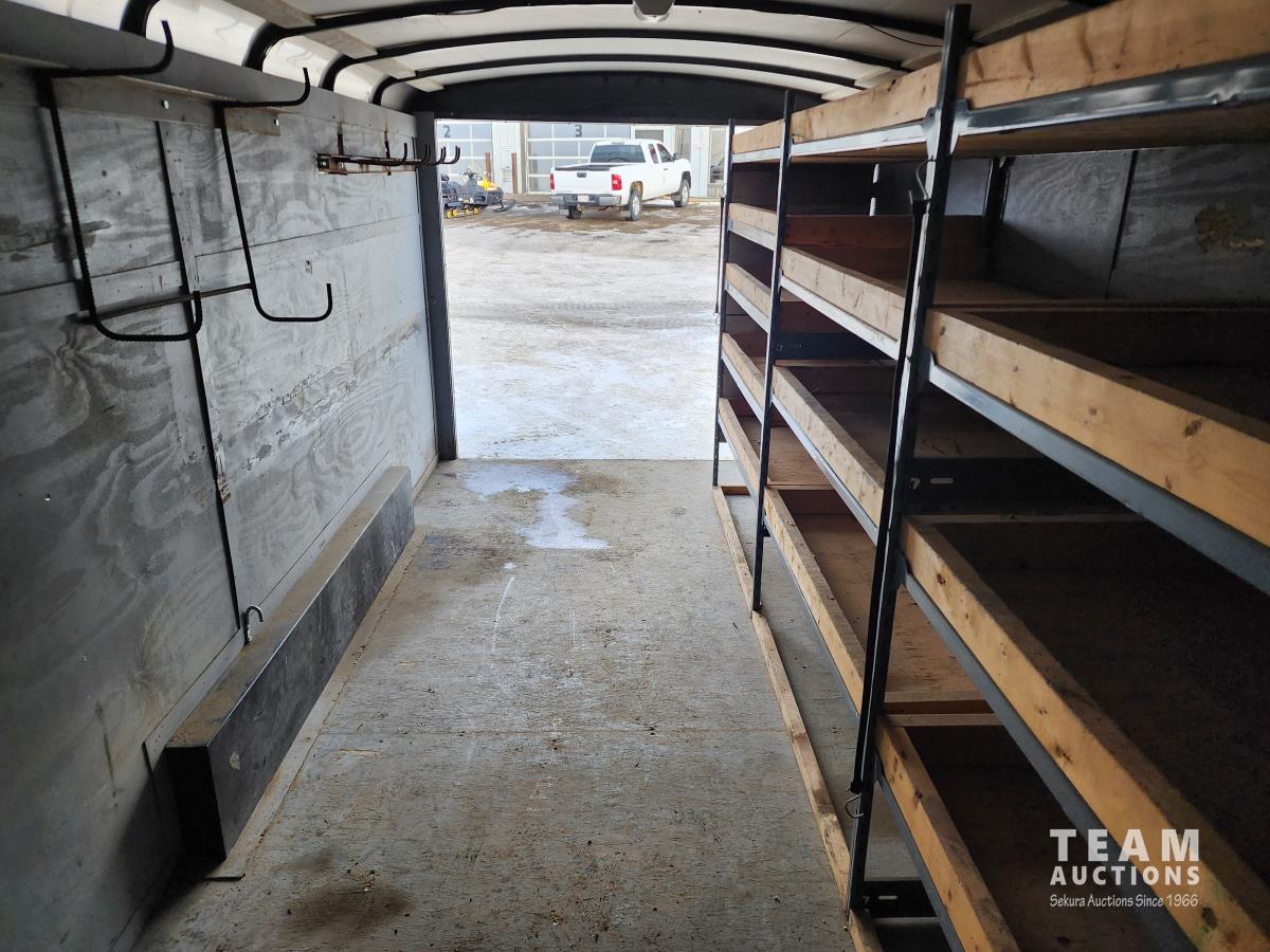 Spring suspension, 3500 lb axles, ball hitch, 83 inch wide, side man door, rear swing doors, shelving, 205/75R15 tires