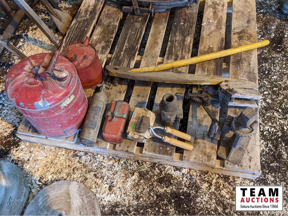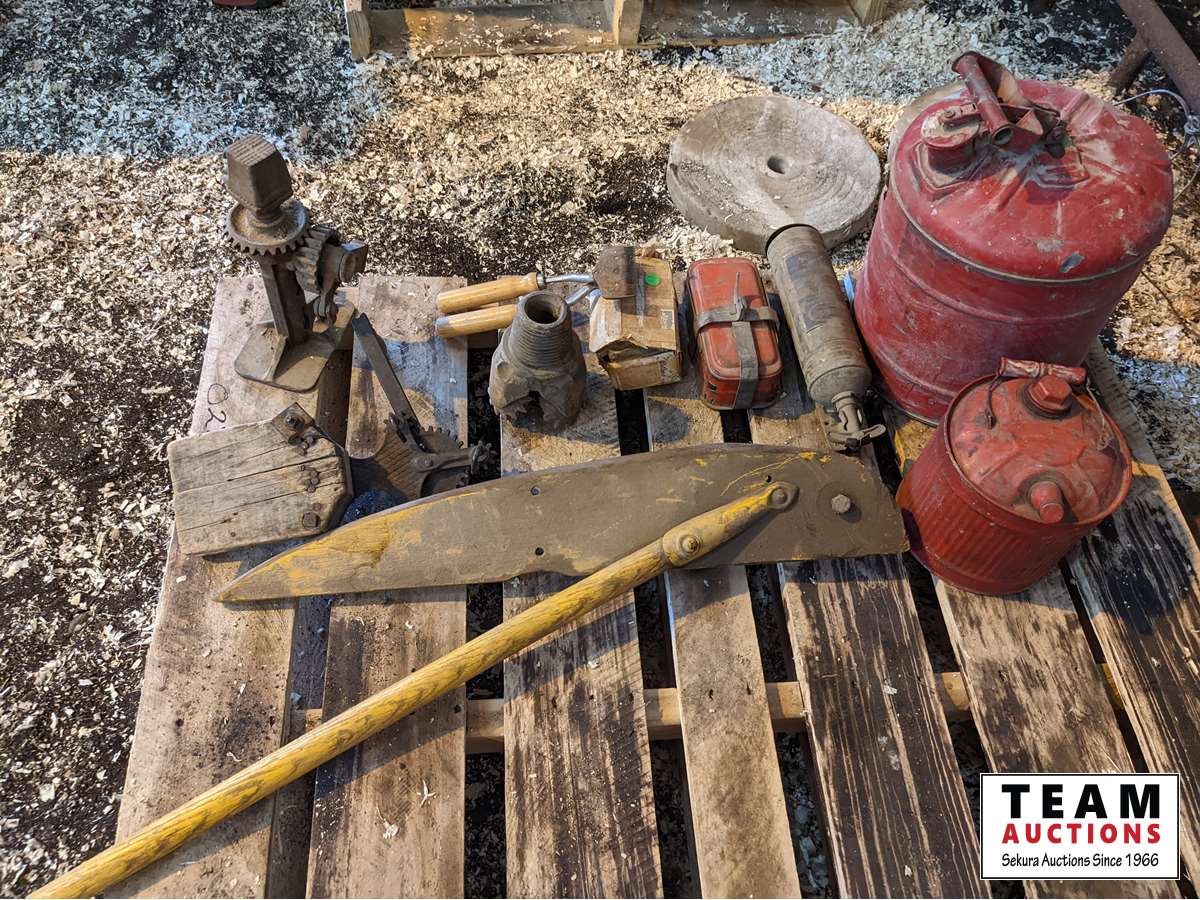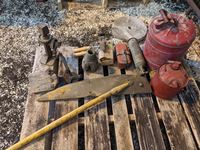 Rope maker, jack, (2) gas cans, drill bit, fire extinguisher, hand clipper, hay mower deflector