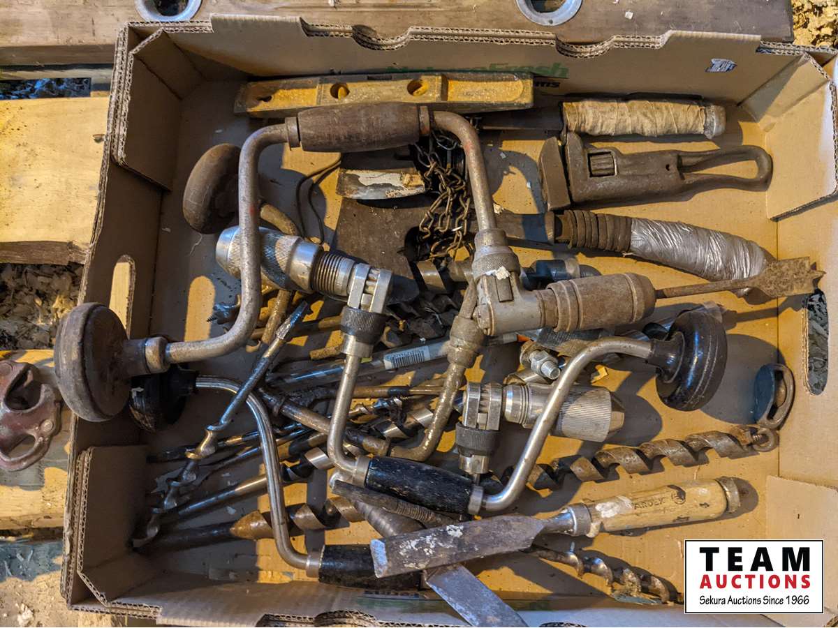 31 Carpenters Brace with Wood Bits, Wire Stretcher, Antique Level