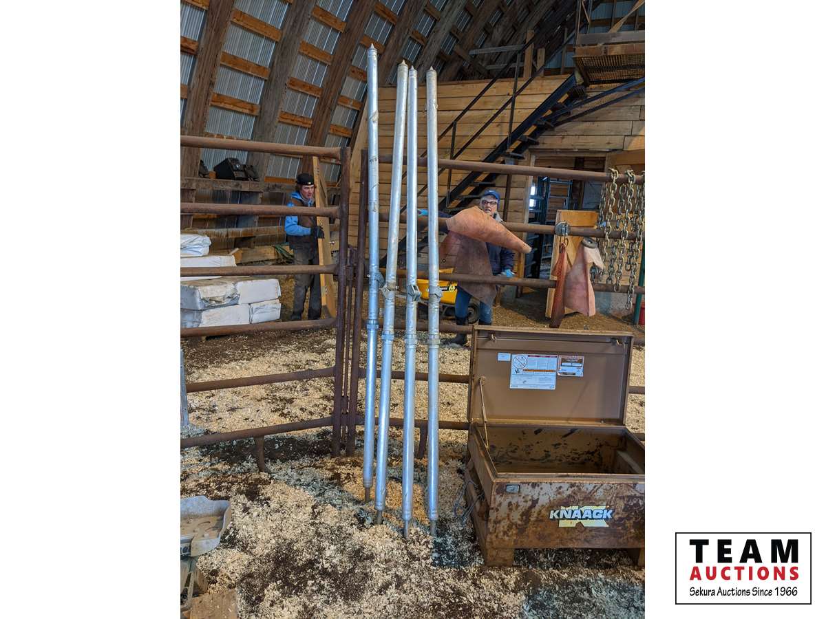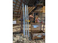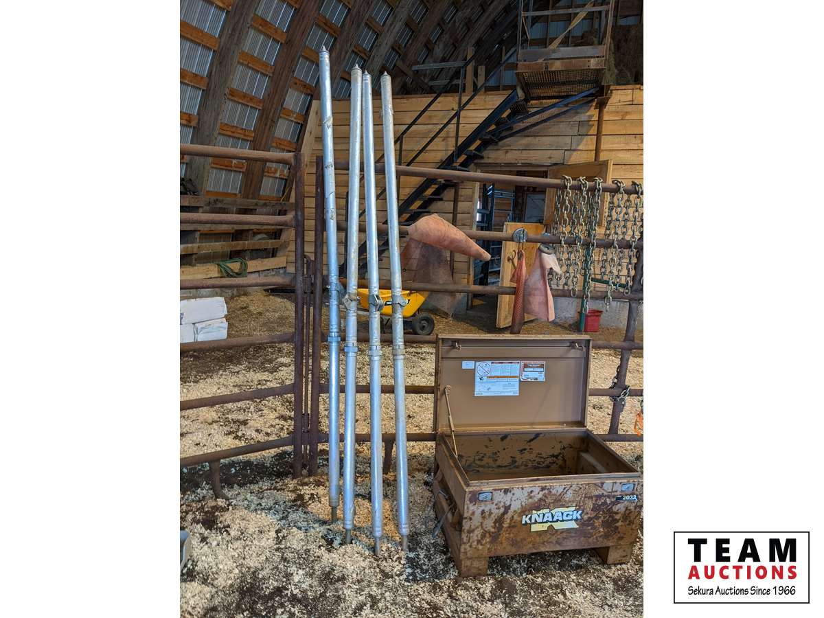 (4) tent posts, Knack 19 inch X 32 inch job box, qty of short lengths of chain, marker flags with magnets