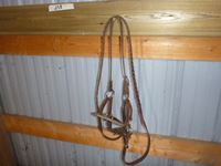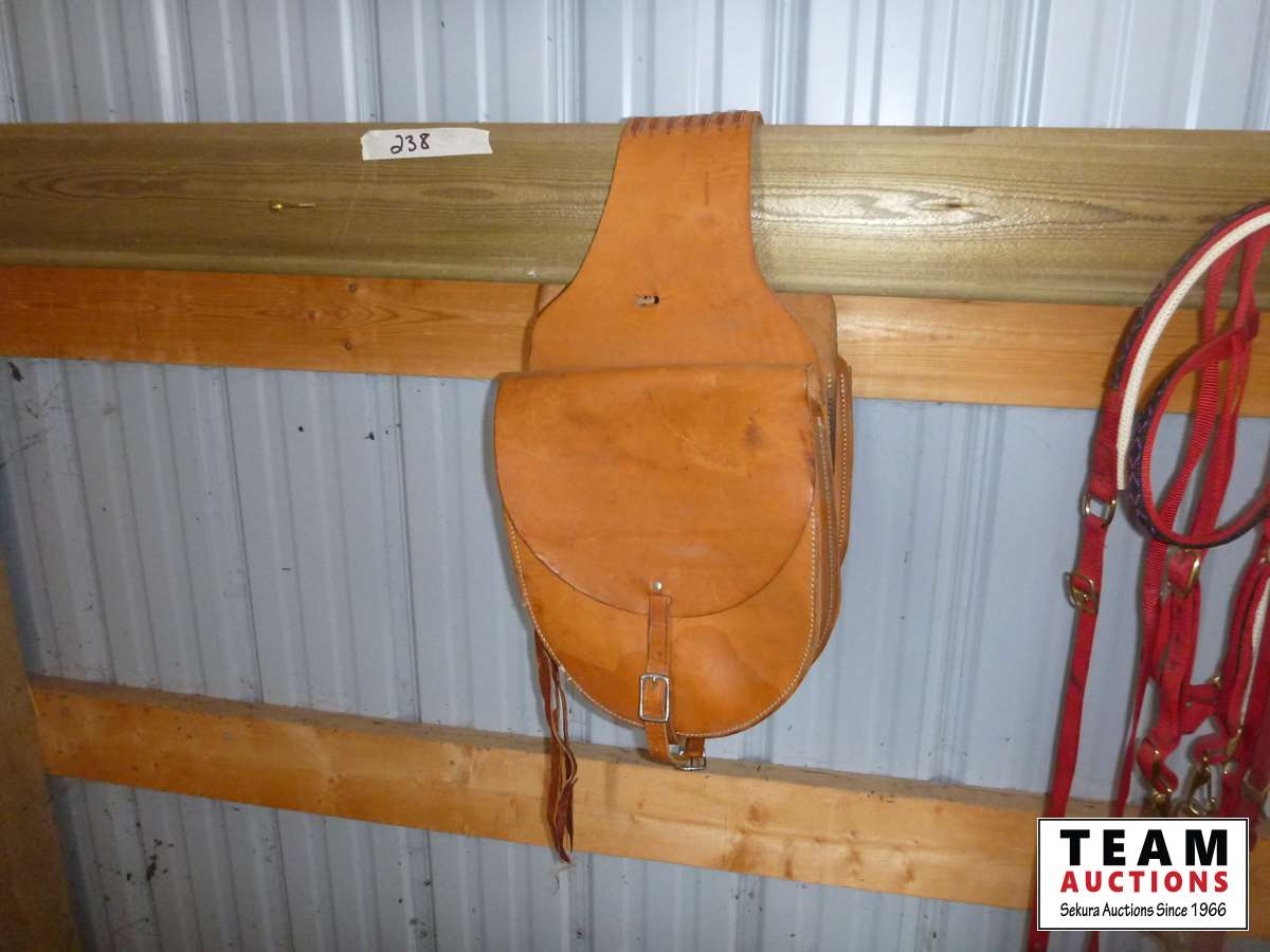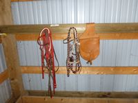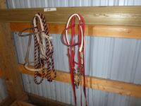 (2) Hackamores, saddle bags, breast collar, red nylon bridle & breast collar set